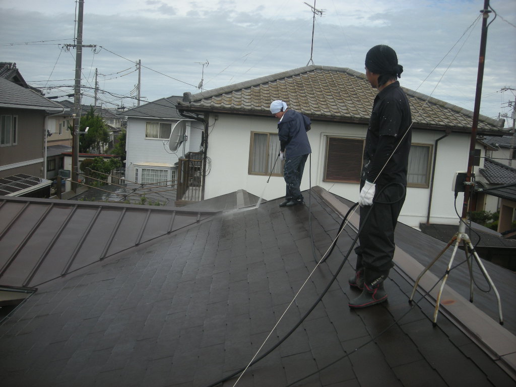 最初にコロニアル瓦屋根の高圧洗浄をします!!