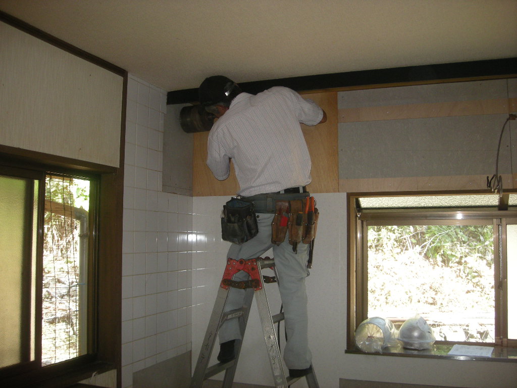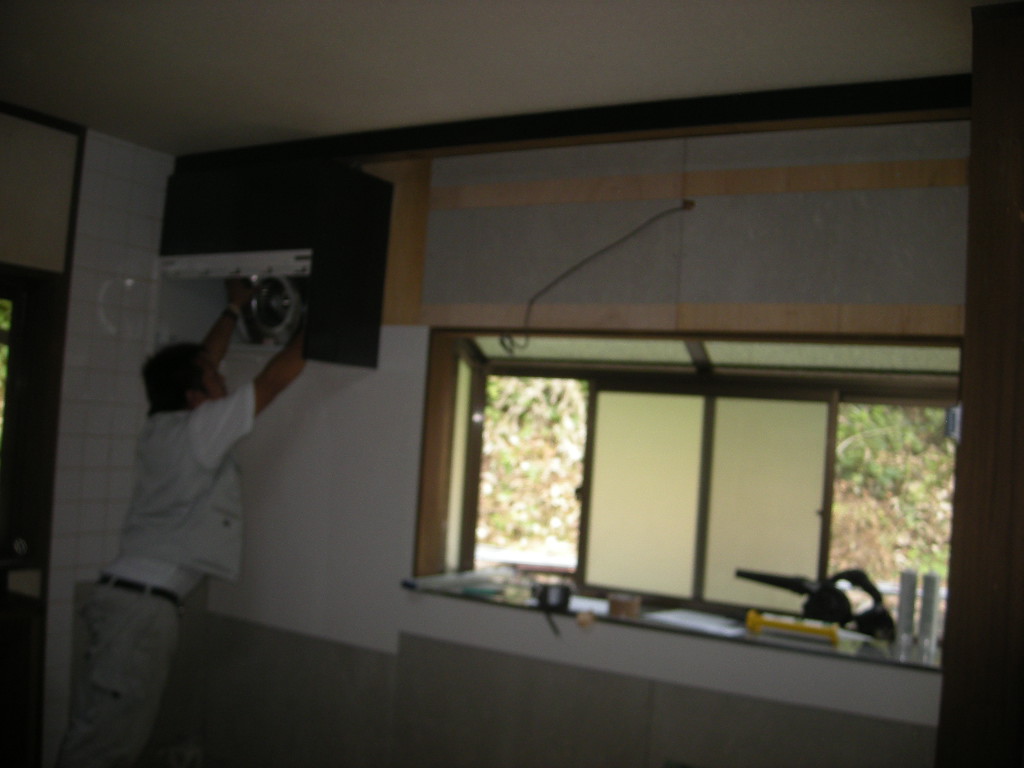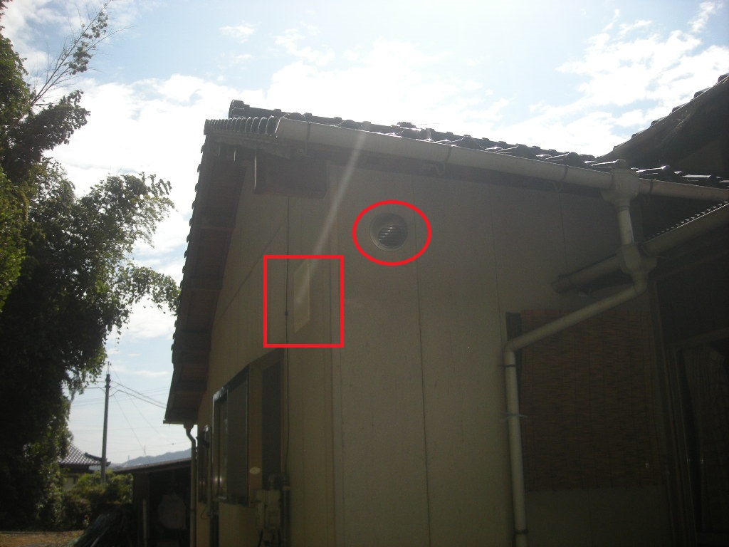 (赤い□で囲ったところに以前の換気フードが付いていました<撤去し外壁も補修しました)!!