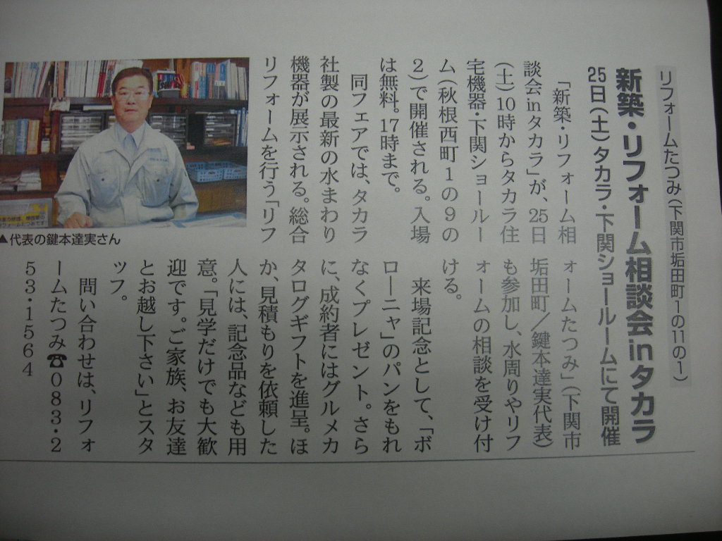 ◎下記日時に「タカラ下関ショールーム」において「新築・リフォーム相談会」と題しまして増改築をはじめ水廻りのリフォームや、その他お家に関するお困り事等の相談会を開催します。
