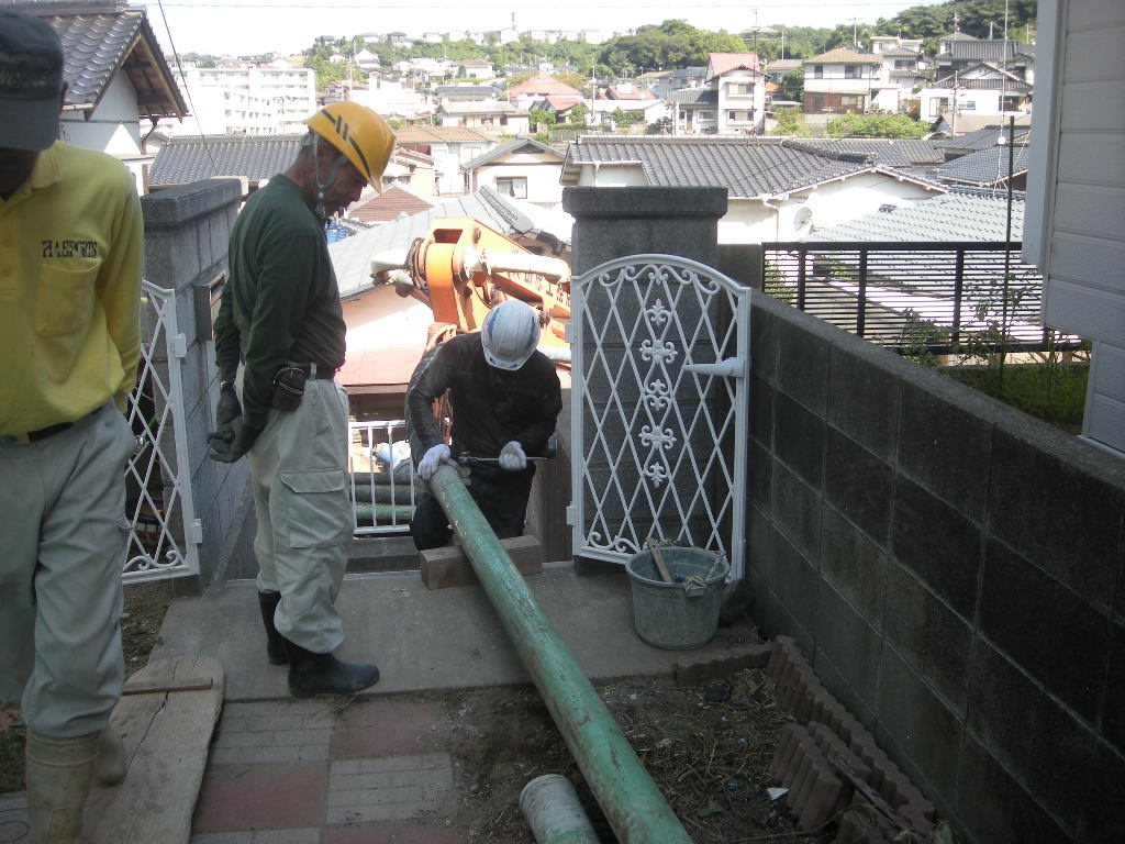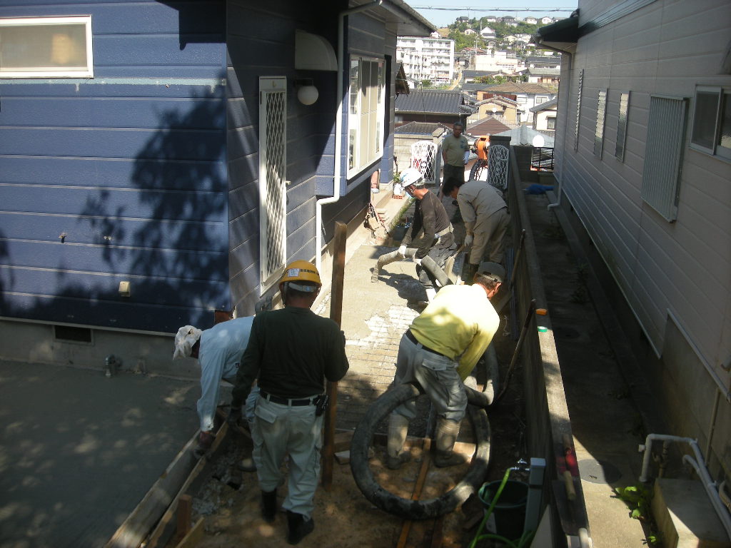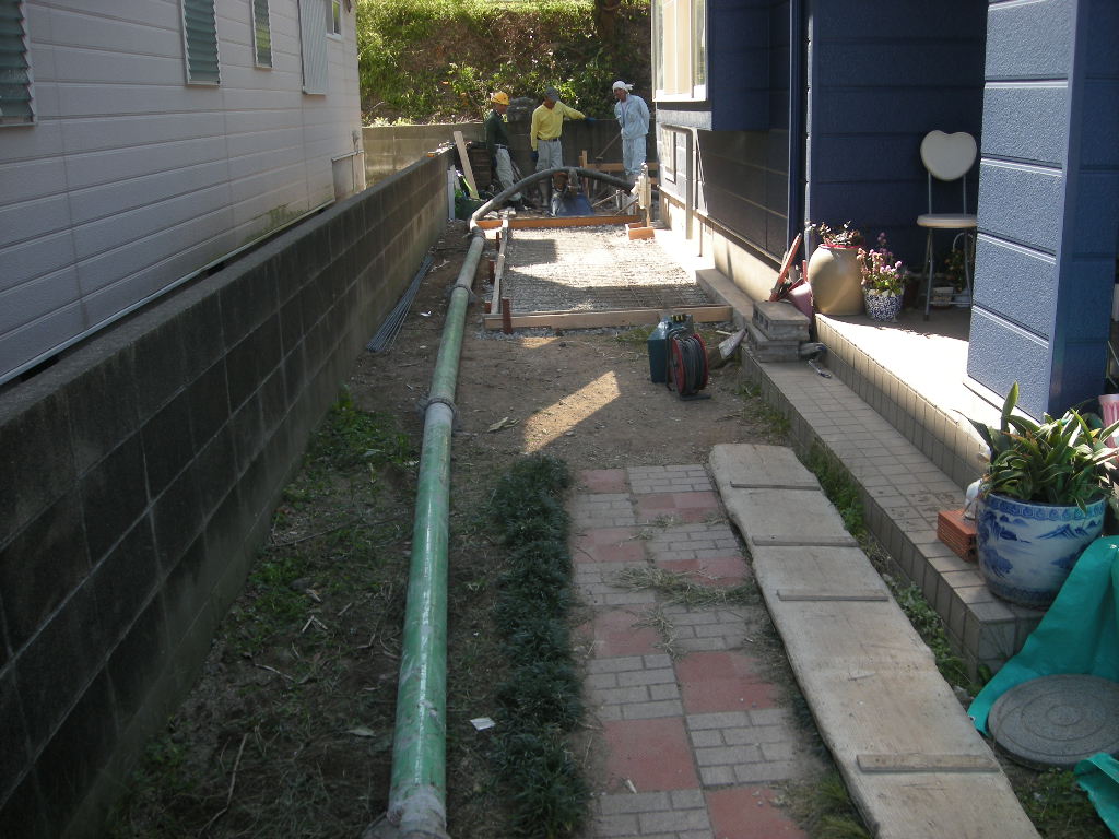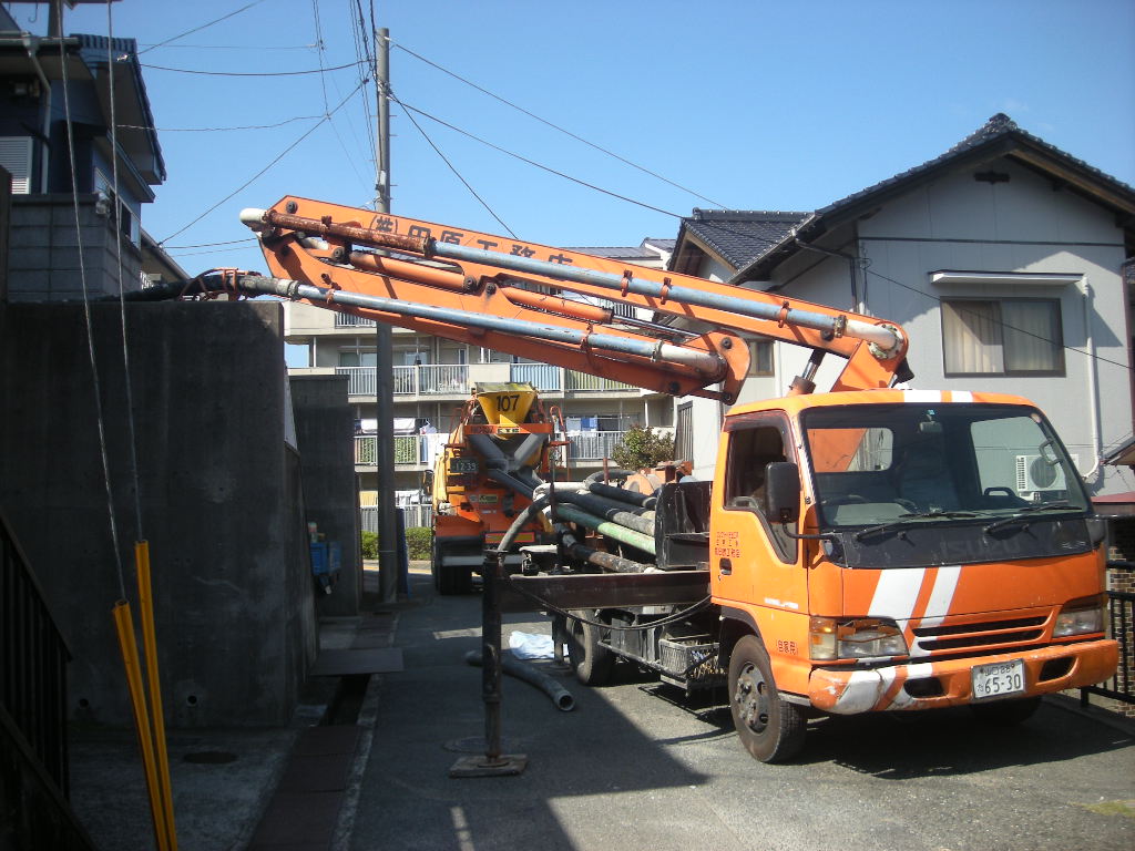 今回の現場は高台に家があると言う特殊な現場のため、生コンを打設する作業にポンプ車を介して生コンを現場まで運び入れることにしました。