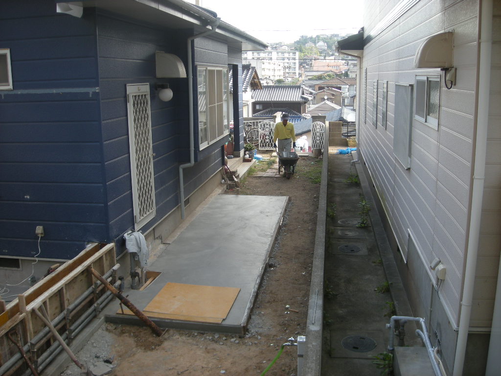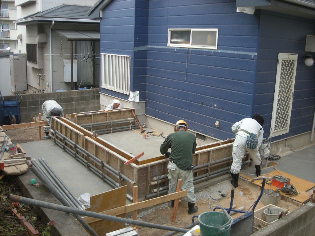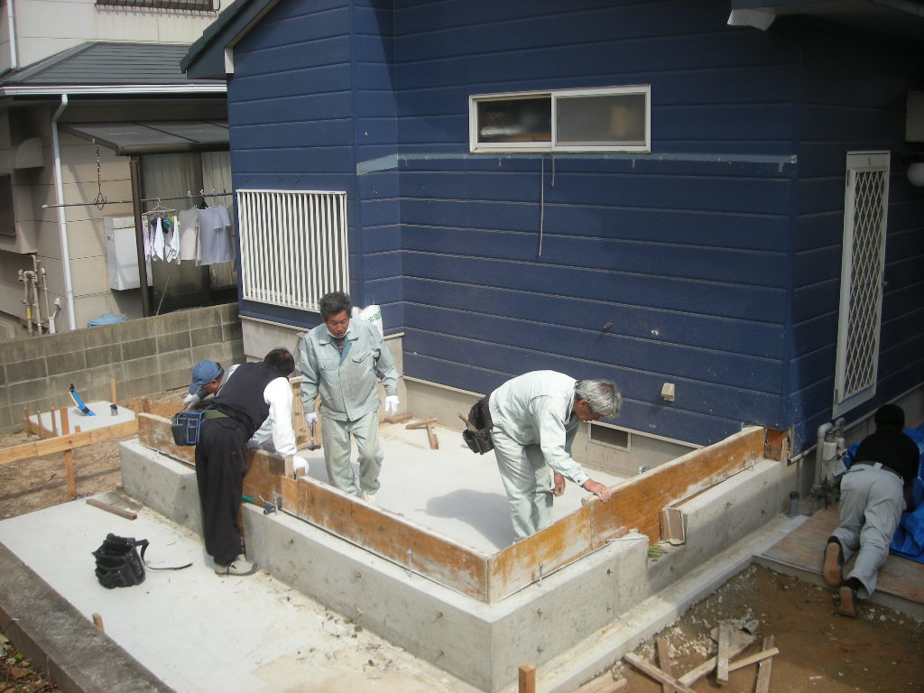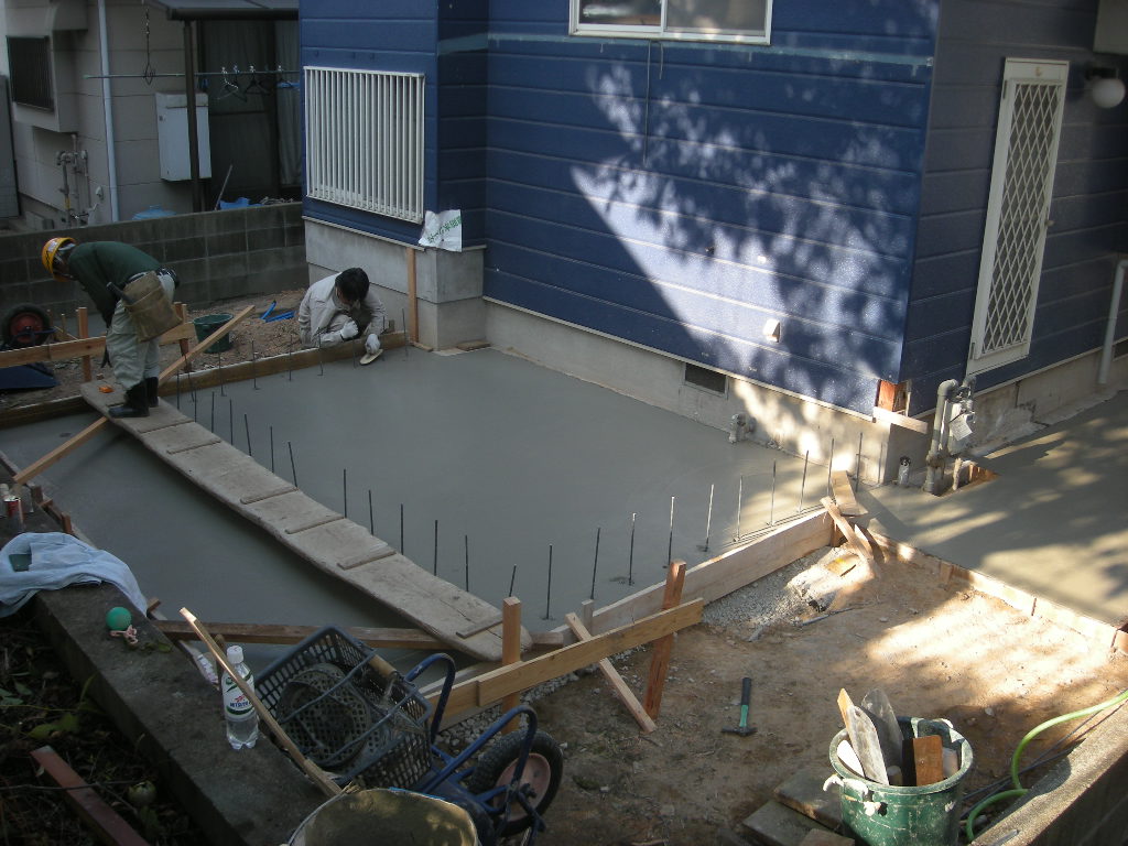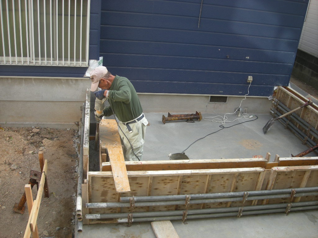 前回増築部分のベタ基礎とウッドデッキの土間部分に生コンを打つ前の準備作業までの様子を紹介しましたが、今回はその部分の生コンの打設と増築部分の立上り基礎の出来るまでの作業の様子を紹介します。