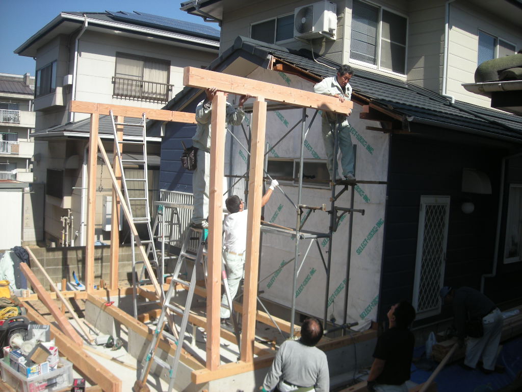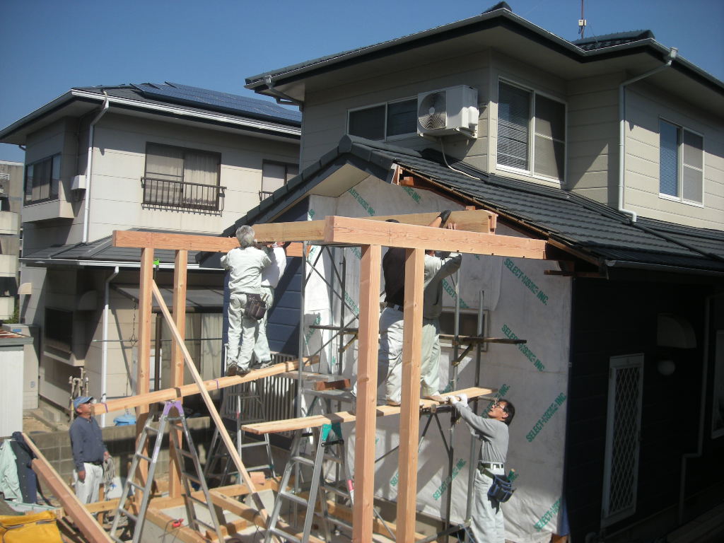 桁と柱を組合せて興して行きます(重機が入らないので、すべて人力で行います)!!