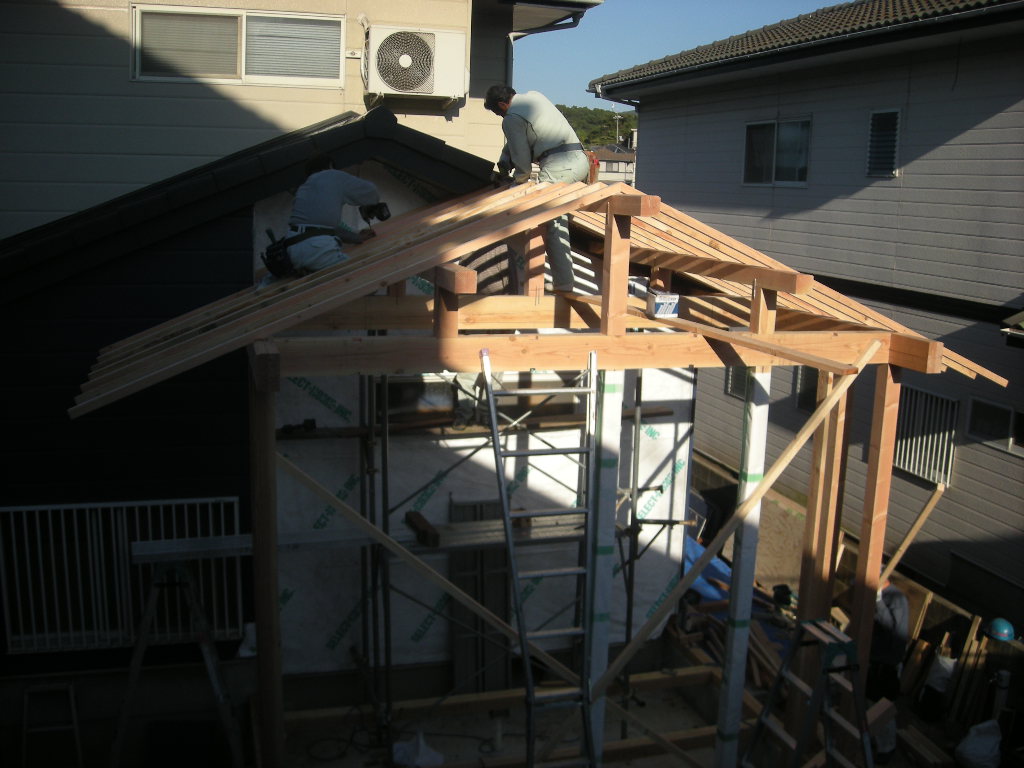 小屋束を立て棟木、母屋を組み込み屋根タル木を施工して行きます!!