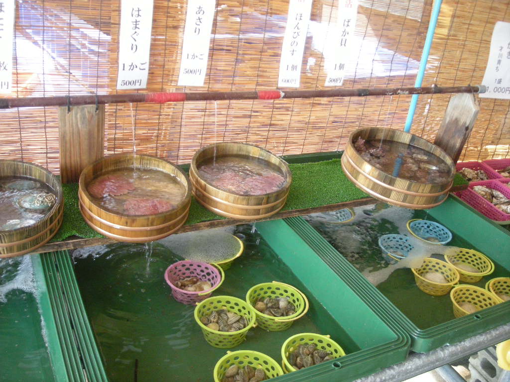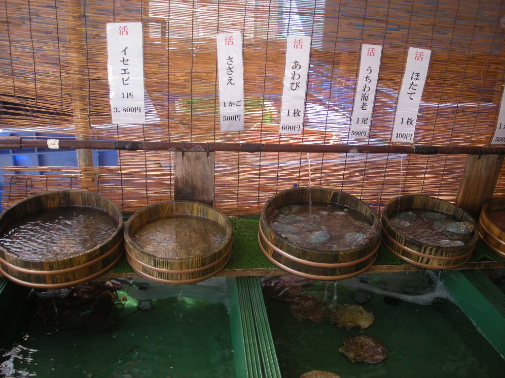イセエビやさざえ、あわび、ほたて貝が水槽の中に入っています!!