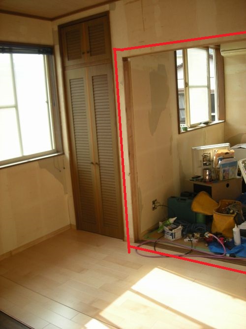 工事前(建具を撤去した状態<赤線の部分を壁にしました>)!!