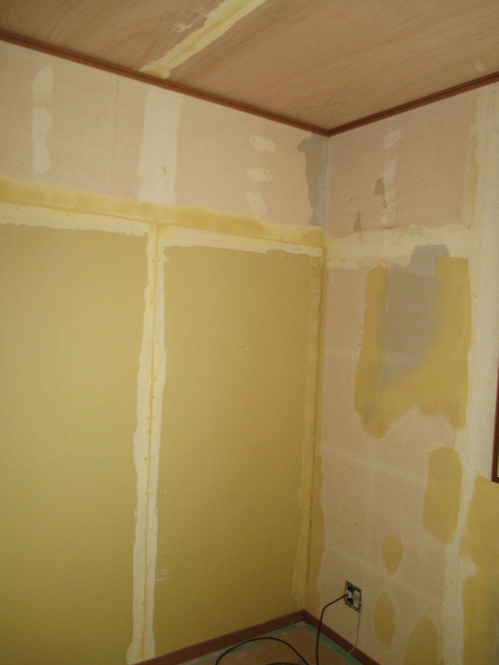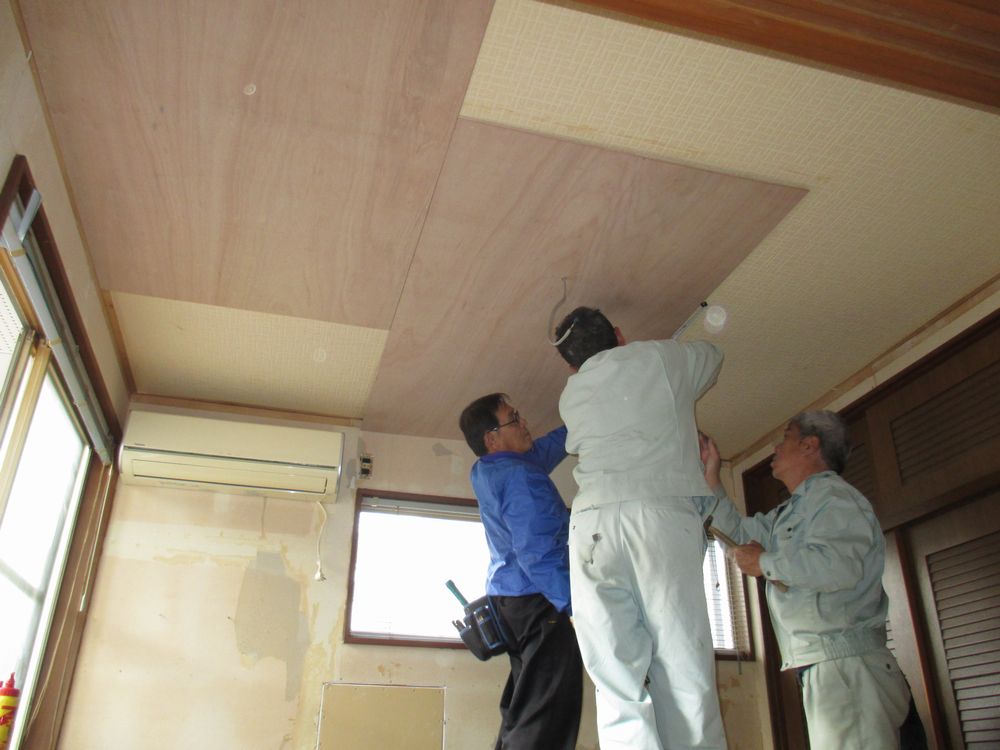 天井にクロス下地のベニヤを張って行きます(2部屋共)!!