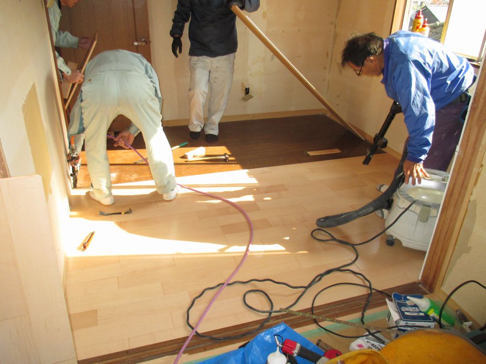 床は既存の上から新規のフロア材を張って行きます(2部屋共)!!