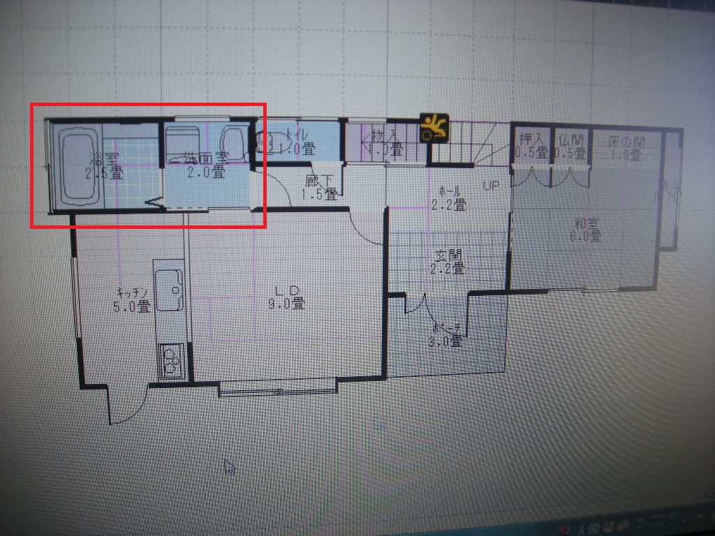 ◎既存の浴室の内部は2,5畳と広いので、今度の新規のシステムバスは1坪(2畳)タイプを設置することになり、