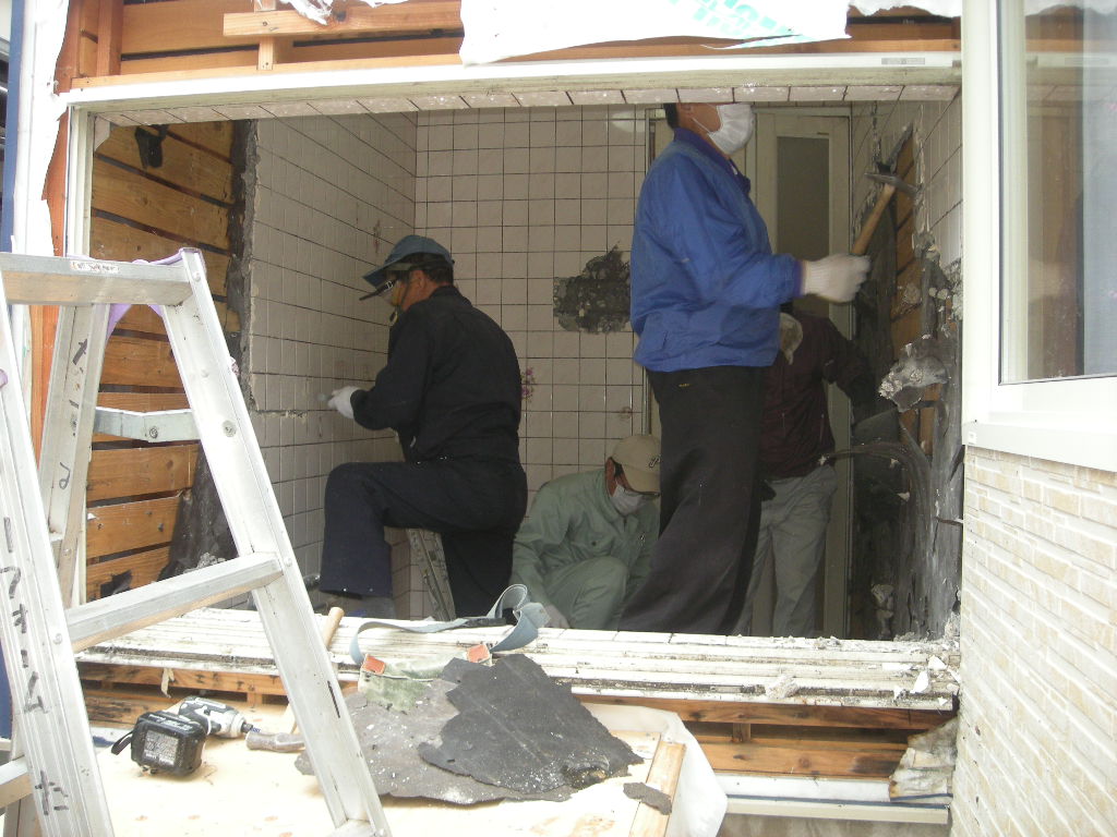 壁廻りのタイルを解体、撤去します(新規のシステムバス<1坪タイプ>)が入らないため!!
