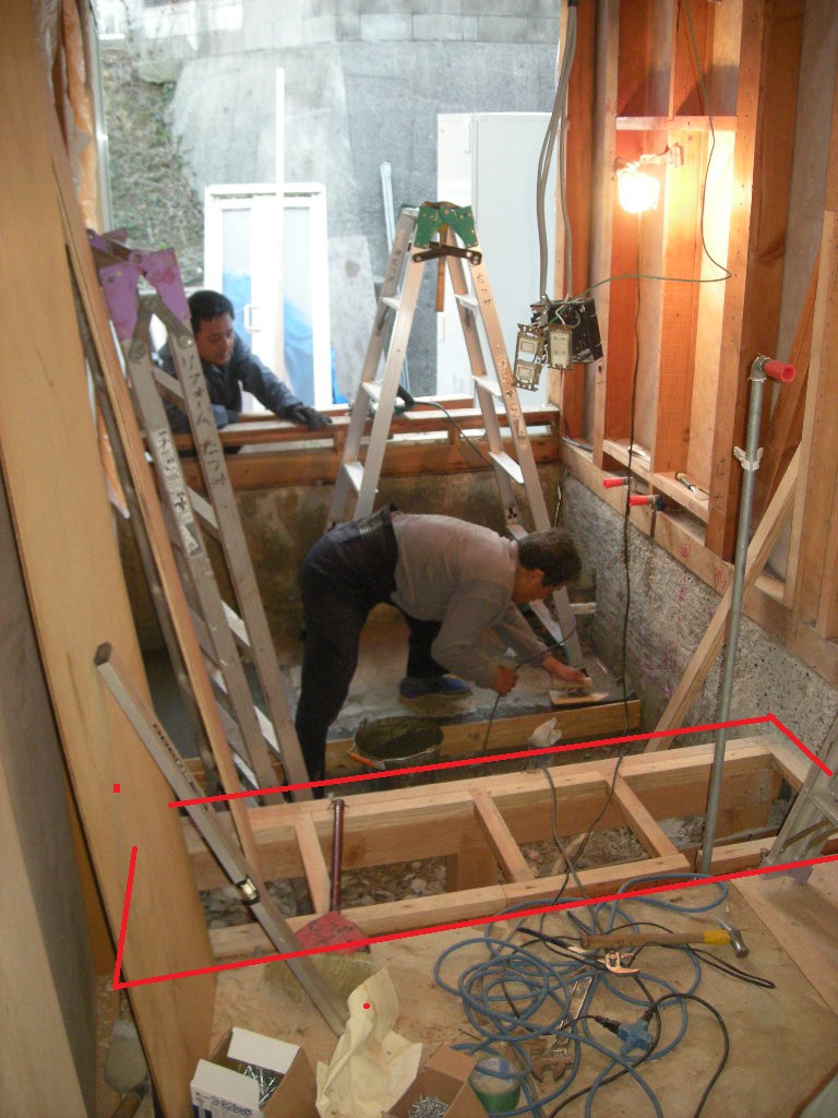 根太を組み赤線で囲った部分程、洗面所が広くなります!!
