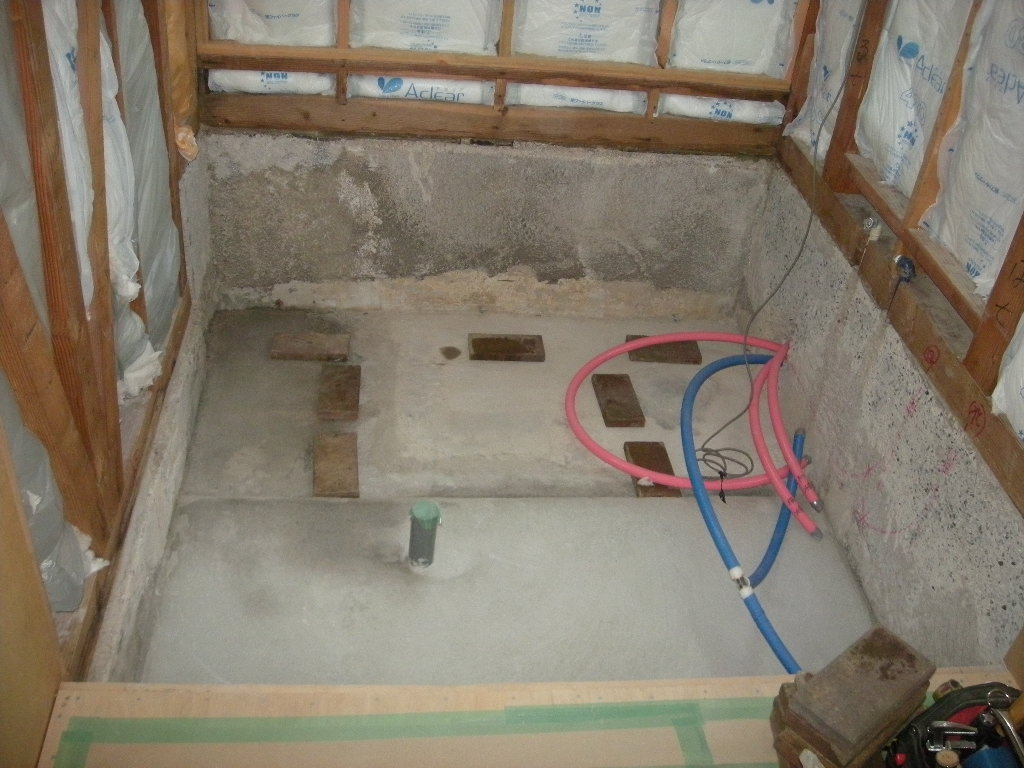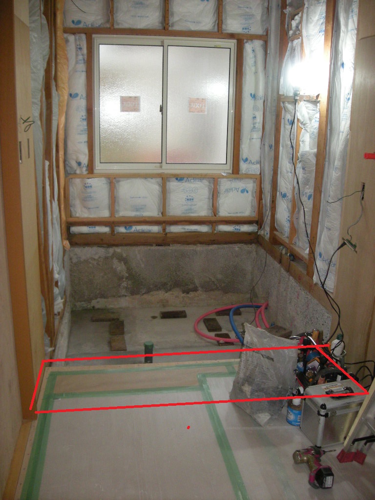 システムバスを組む前の準備作業が完了しました(赤線で囲った部分程洗面所が広くなりました!!
