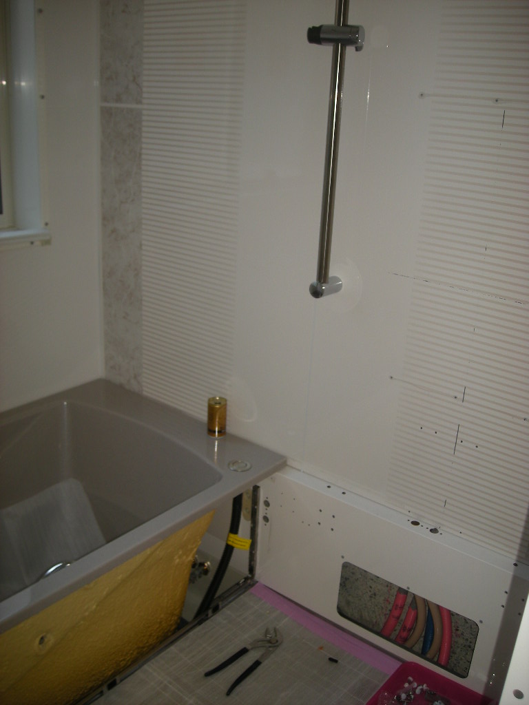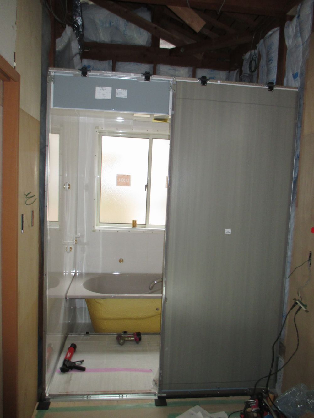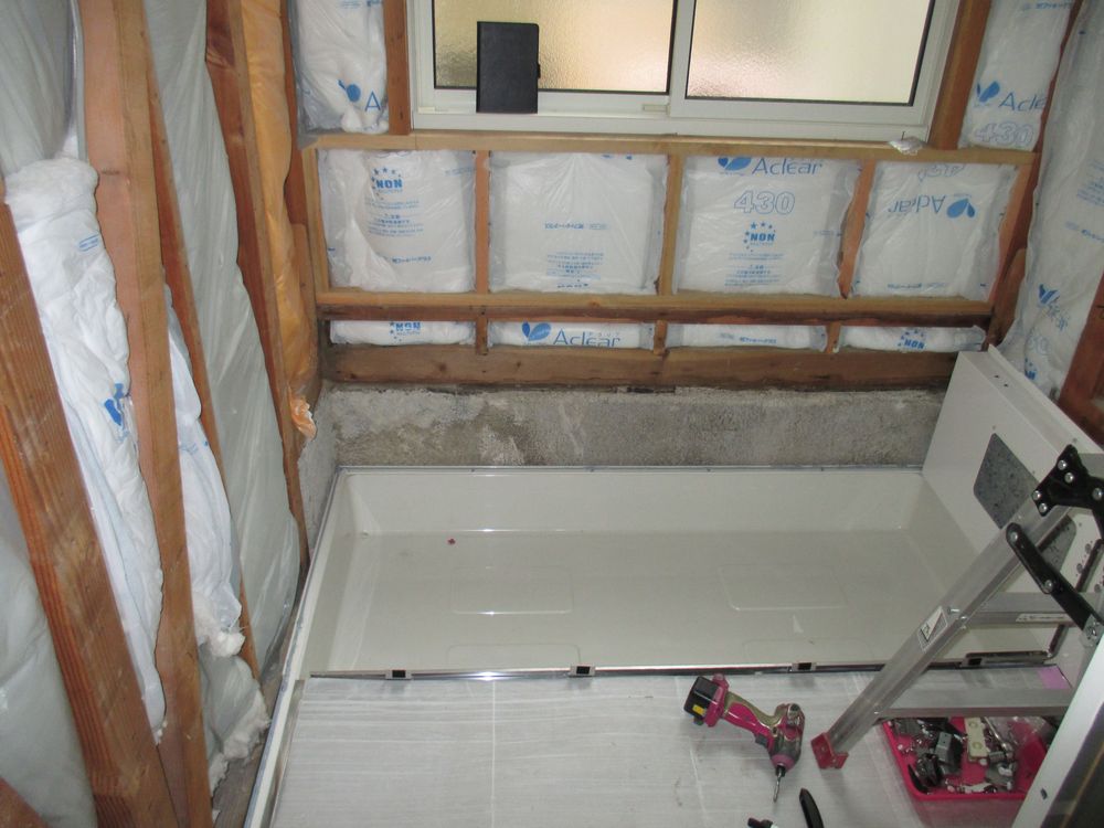 浴槽を設置し、順次壁パネルを組んで行きます!!