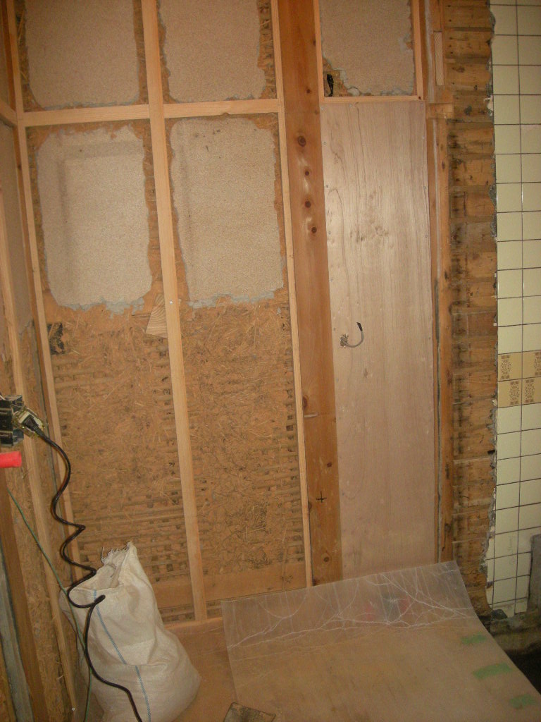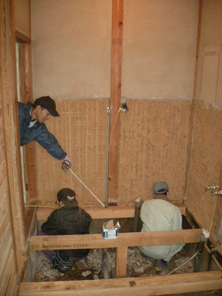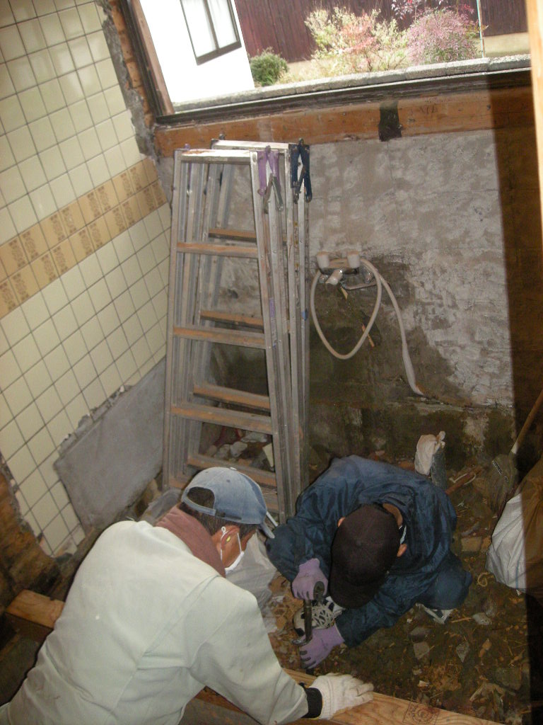 洗面所の床と壁の下部のタイル部分を解体、撤去し土台から造り直します(外から見る)!!