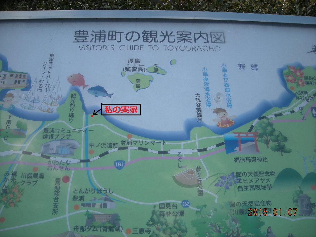 そこの公園にある豊浦町の観光案内図です。私が生まれ育った所(18歳まで<海まで100m位でした>)も
