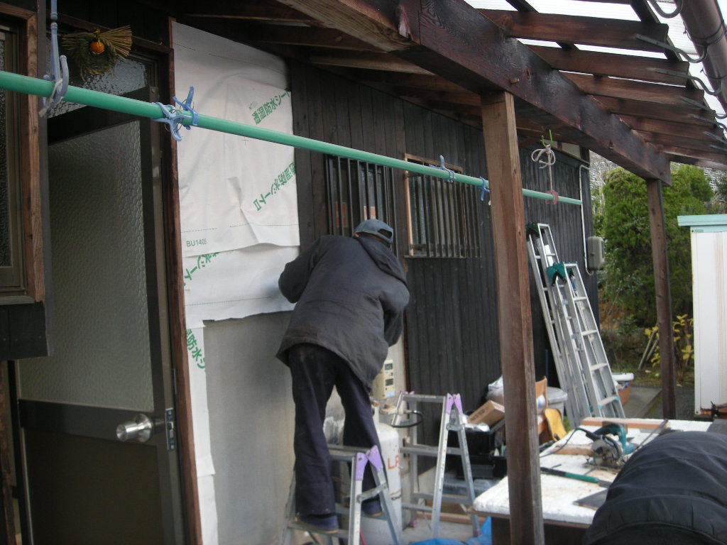 外廻りも壁になった部分に新規の焼き杉を張って行きます!!