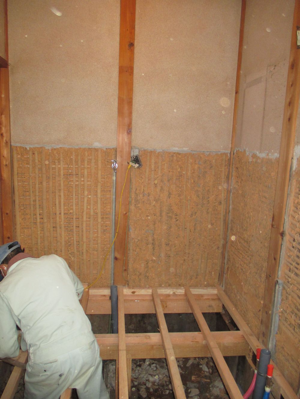 つづいて土台の上に根太(タル木)施工し、新規の化粧台用の給排水管の整備も完了です!!