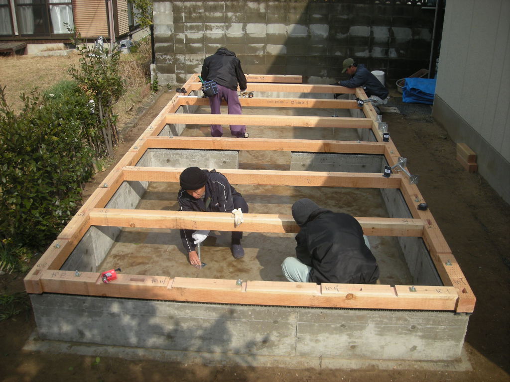 つづいて半間(910mm)ピッチに大引きを組み入れて行きます!!