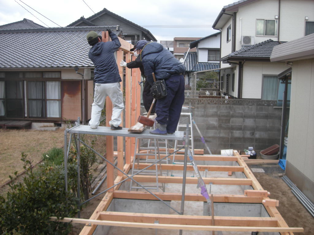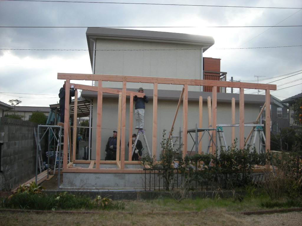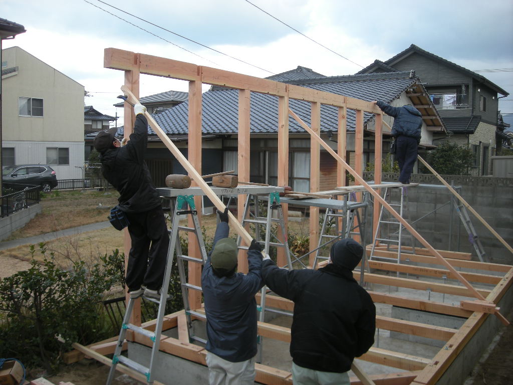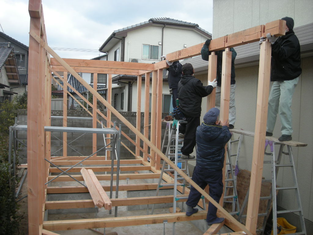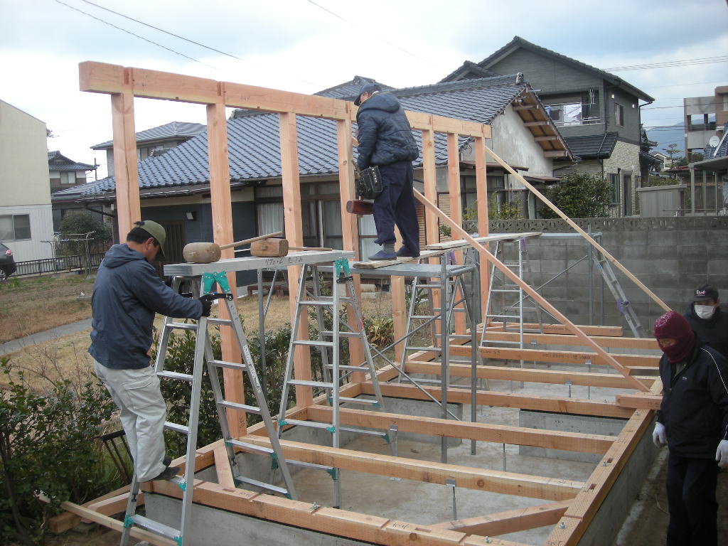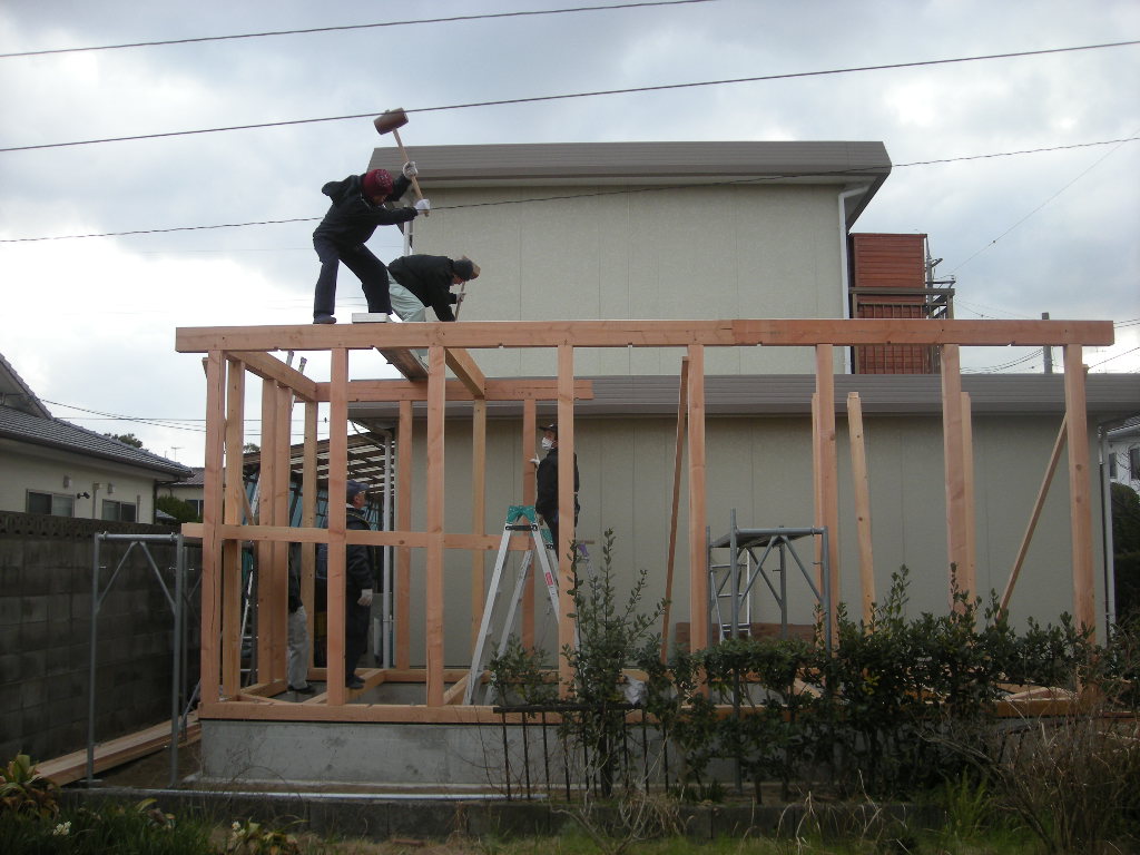 綾羅木某邸の離れ新築工事も、いよいよ棟上げ作業へと入りました。
