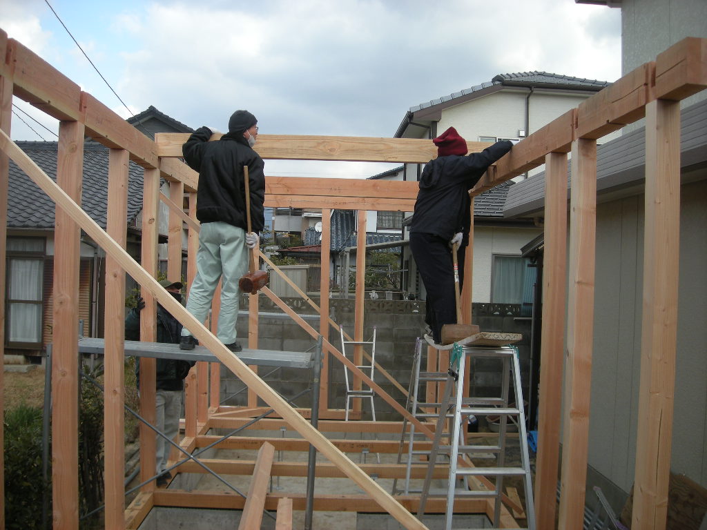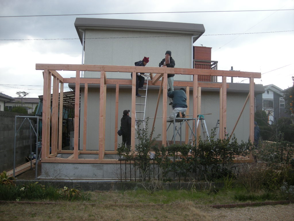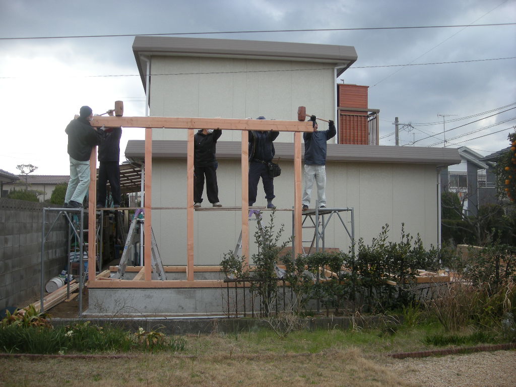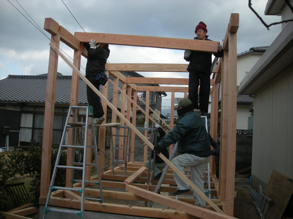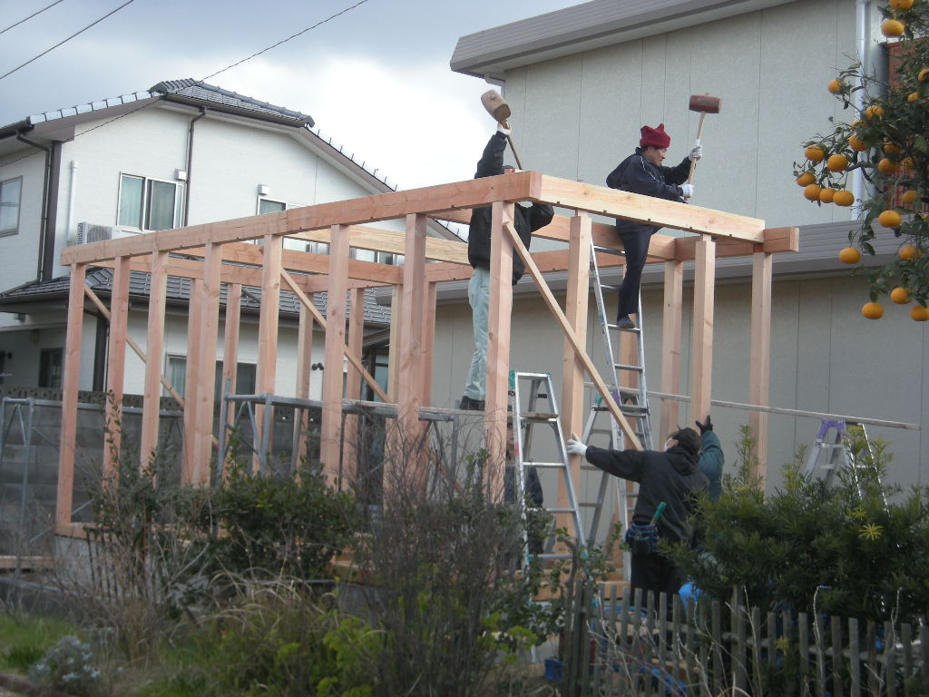 北面も柱と梁を組み込み、かけやでしっかり叩き込みます!!