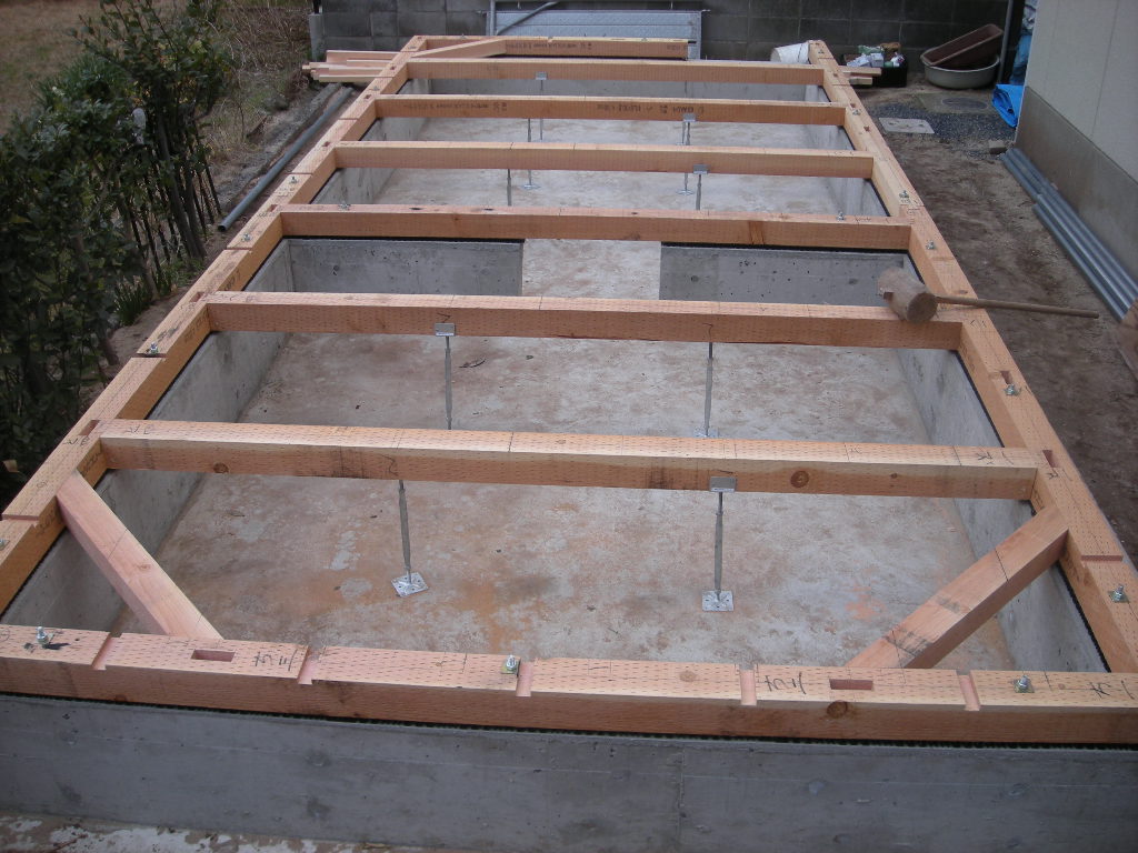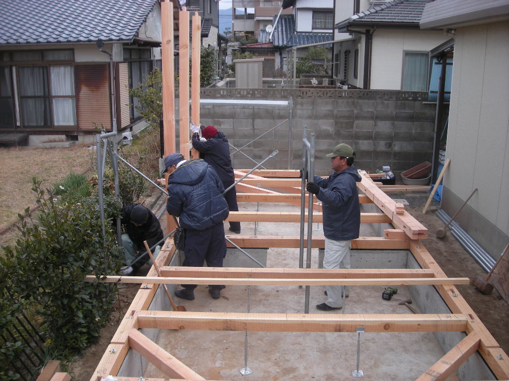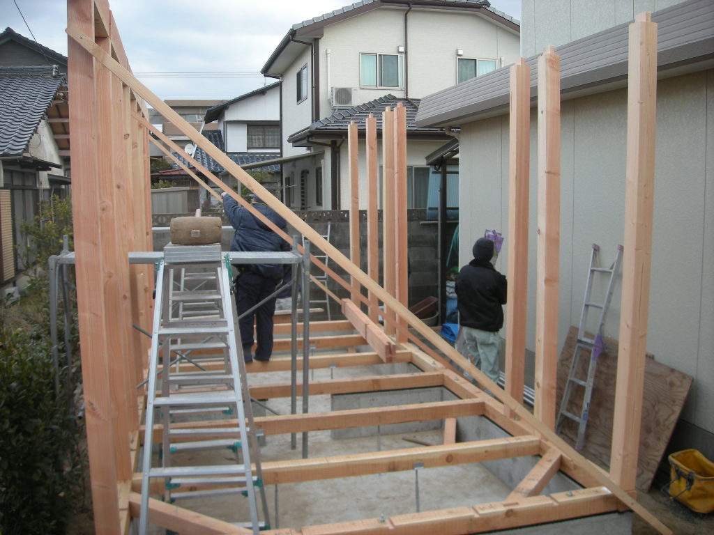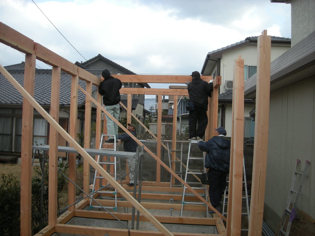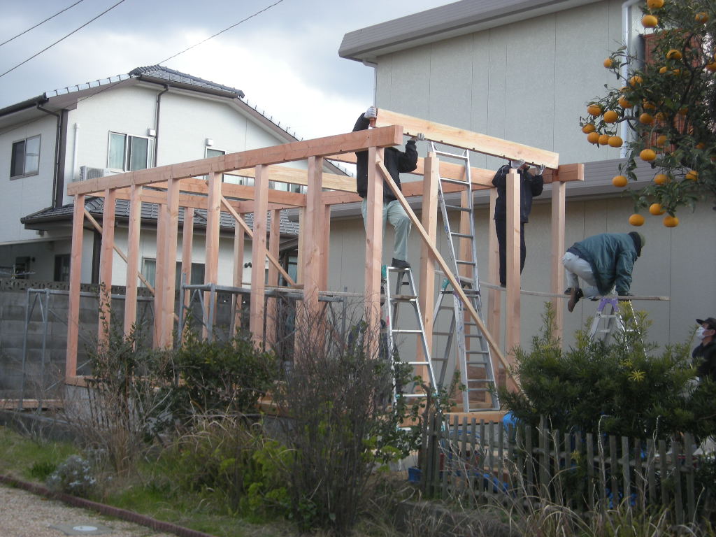 北面も柱と梁を組み込み、かけやでしっかり叩き込みます!!