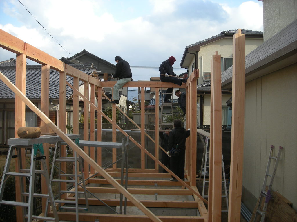 ここまでで、初日の棟上げ作業の半分が終了しました。