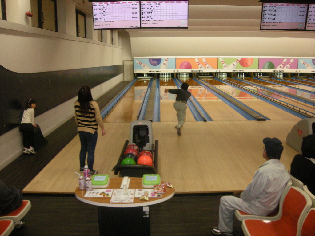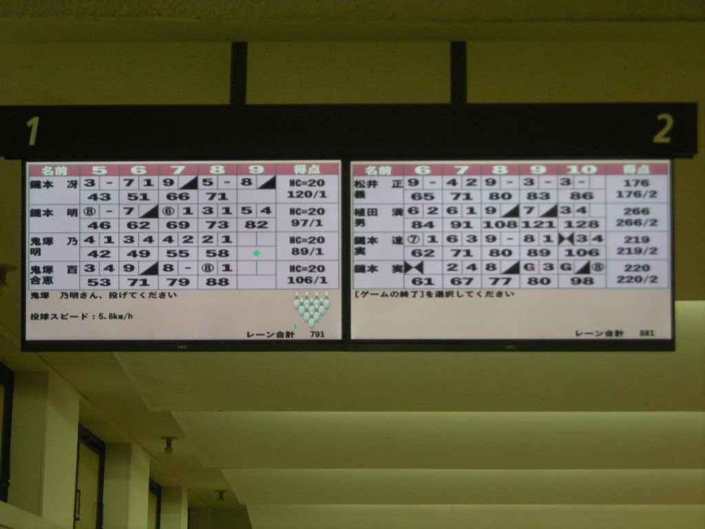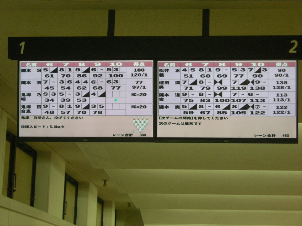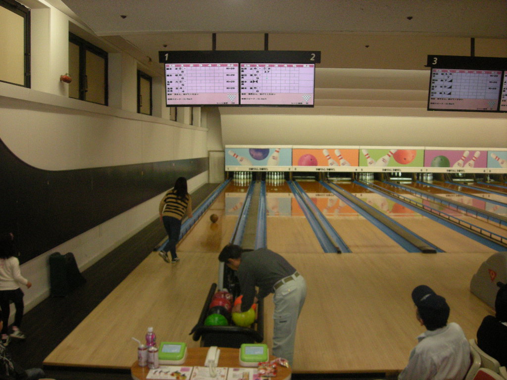 左のレーンで息子のお嫁さんが投げました(娘の明ちゃんが後ろで応援しています)!!