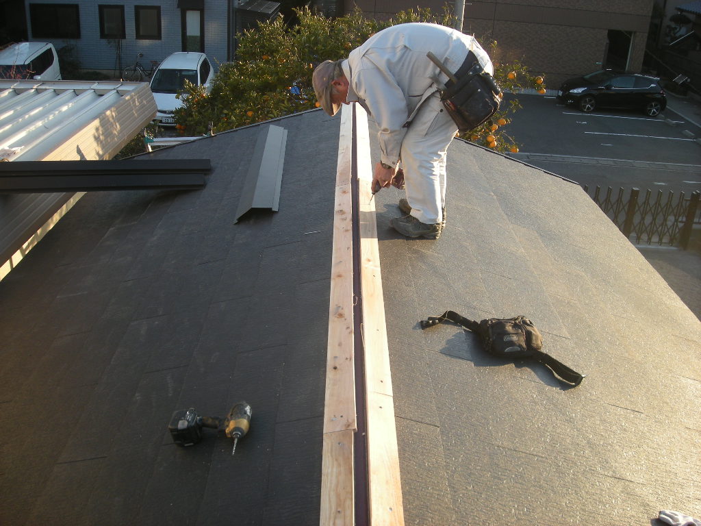 棟の両側に、棟の板金を施工するための下地となる抜き板を施工します!!