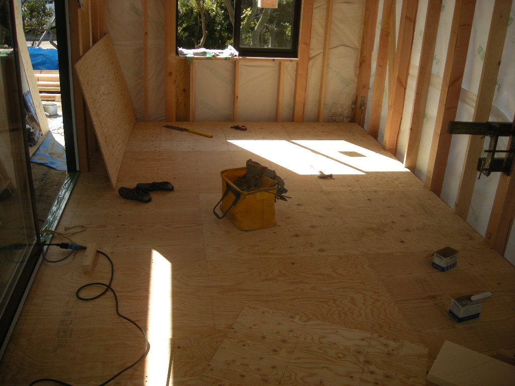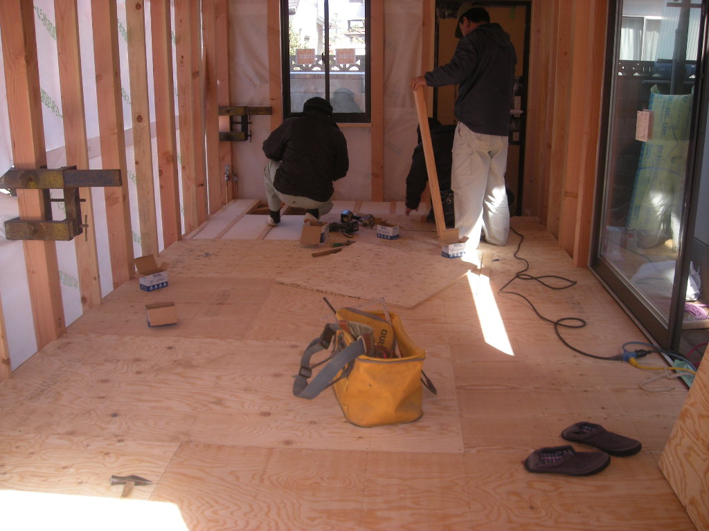 つづいてフロア材の下地の、捨て貼りコンパネを南側から張って行きます!!