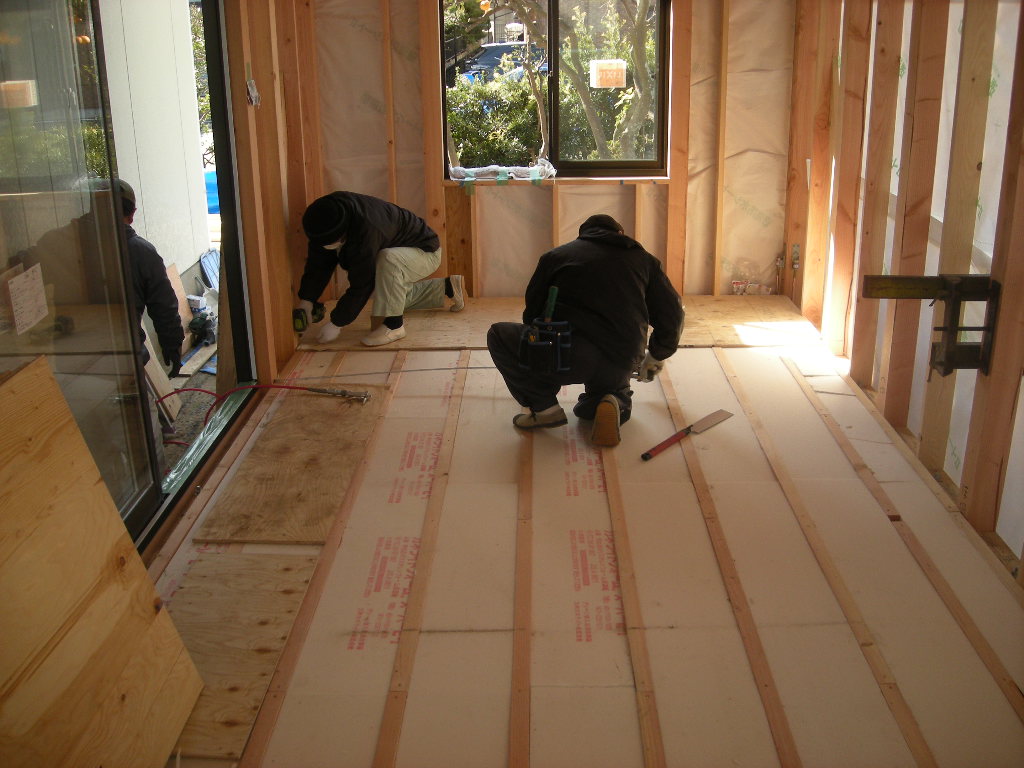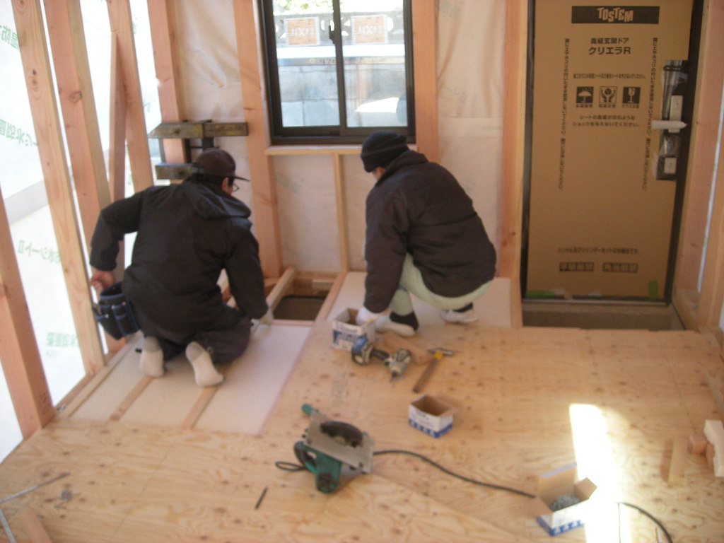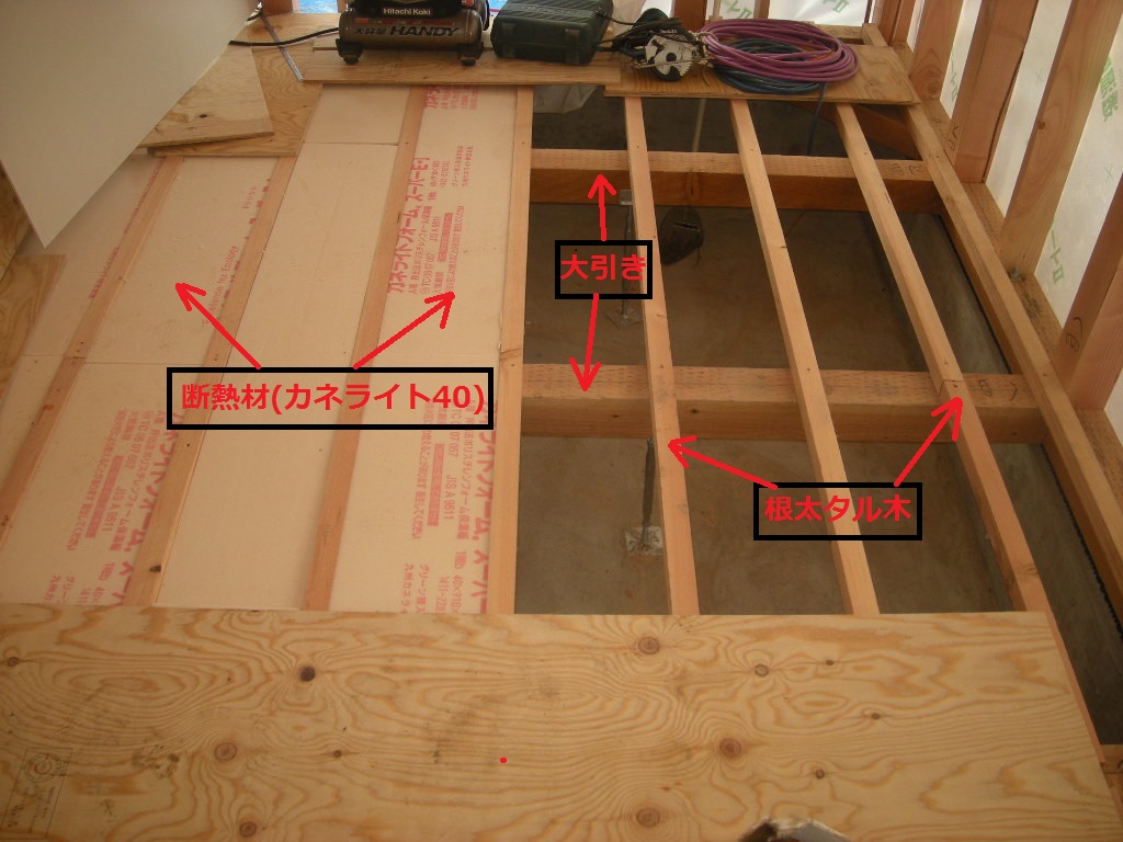 床廻りに大引きの上に根太タル木を施工し、その間に断熱材(カネライト40)を入れます!!