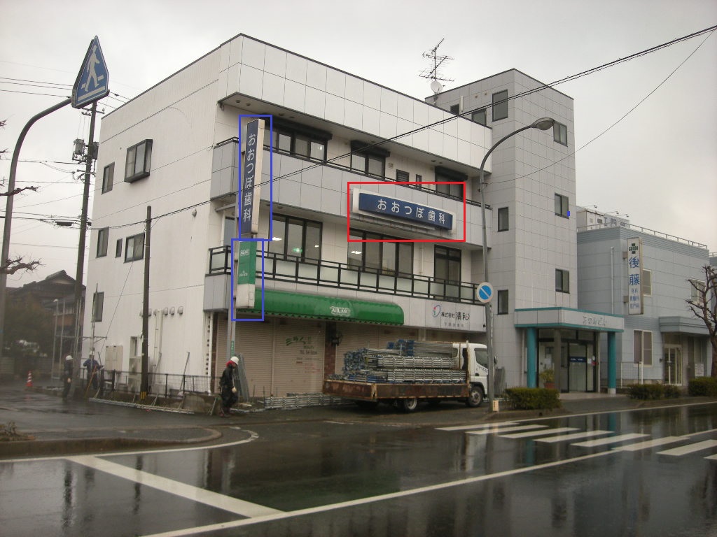 青線で囲った大坪歯科さんの縦看板とその下にある美容院の縦看板は、そのまま残す予定