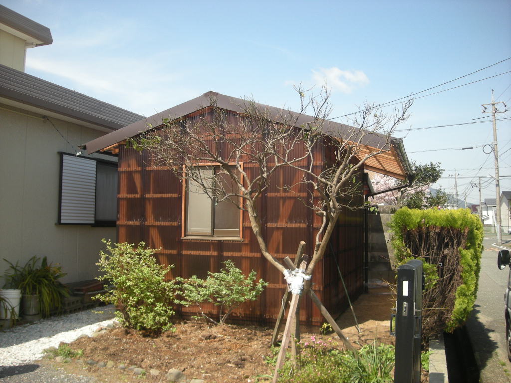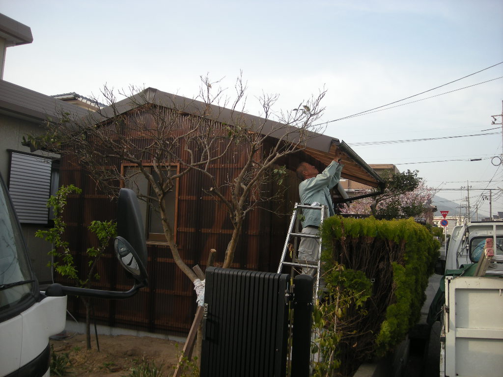 現場の外観を正面から見る(左側に10畳の離れを新築し、右側に倉庫を新設しました)!!