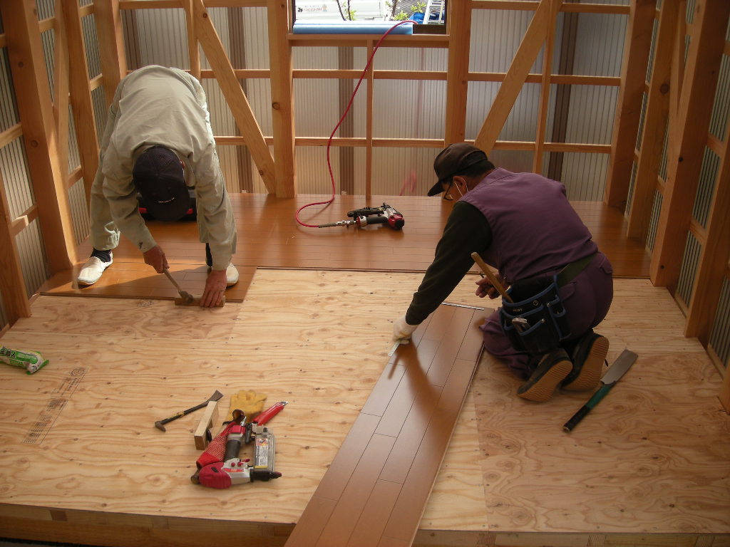 捨て張りを張った上に、フロア材を施工して行きます!!
