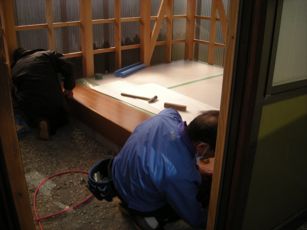 フロア材を張ったら、前面に上がり框(化粧板)を施工します!!