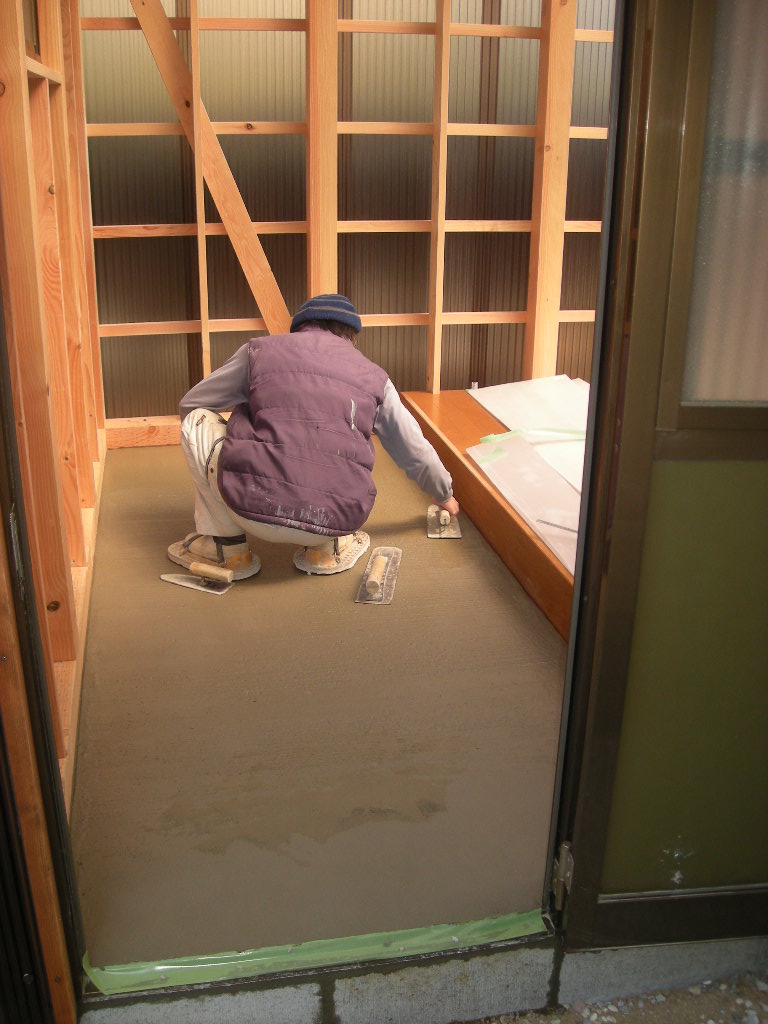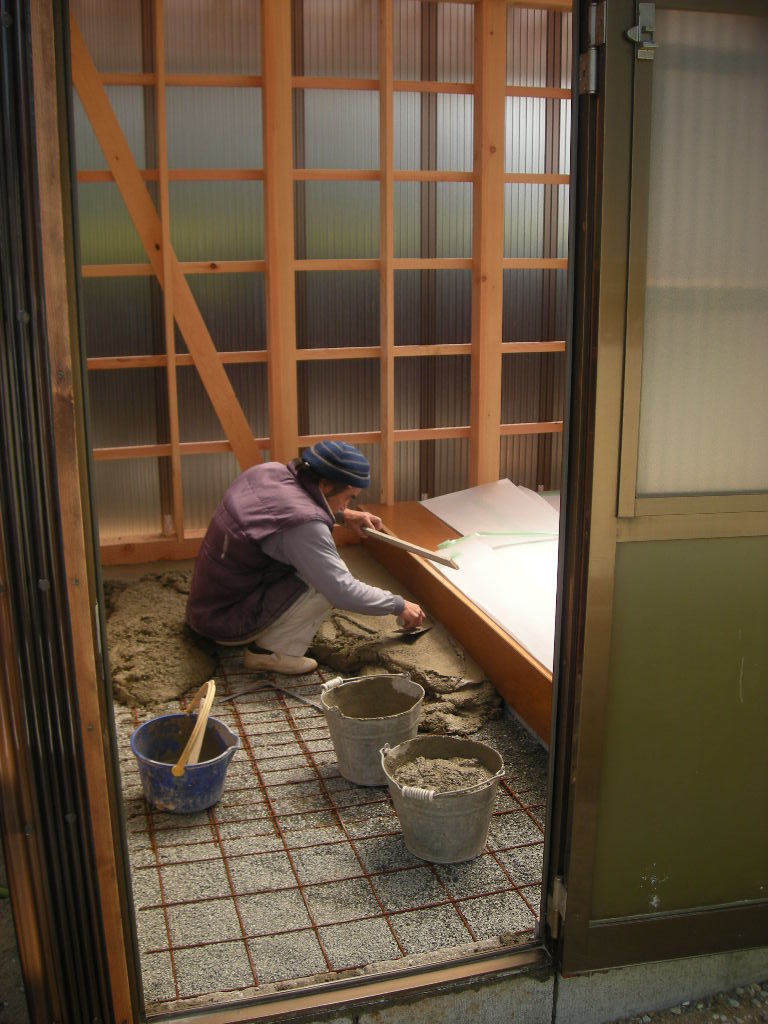土間部分を整地、下地整備後、ワイヤメッシュを敷き、生コンを打ちます!!