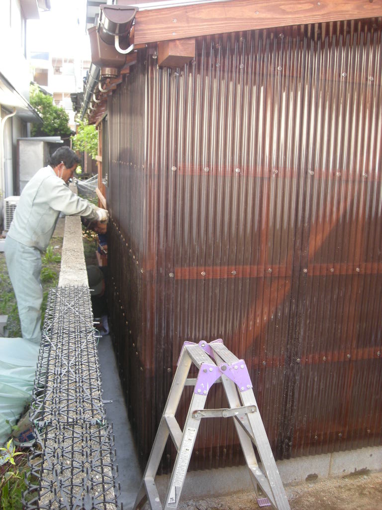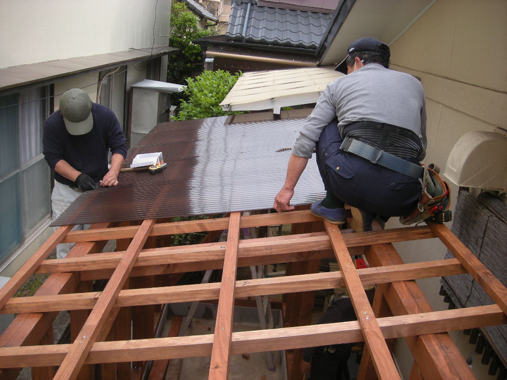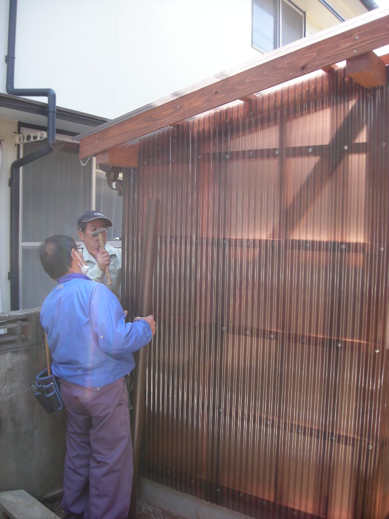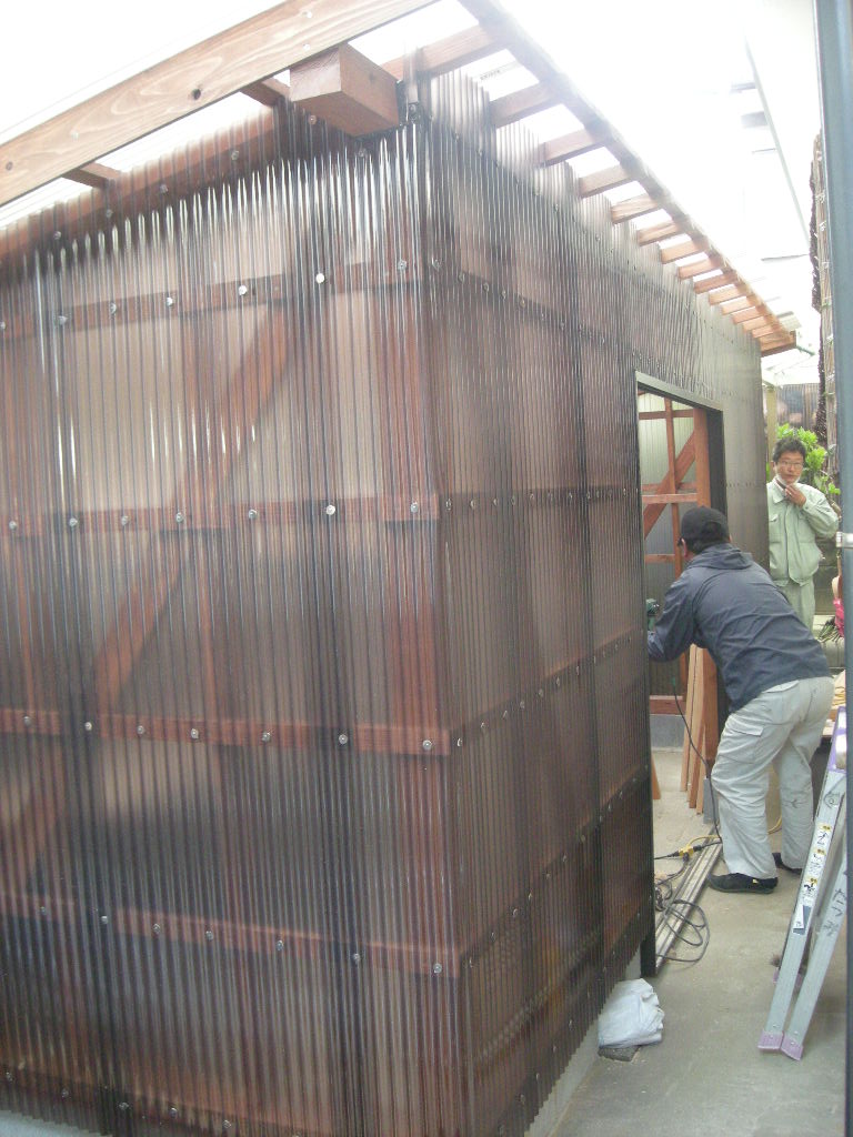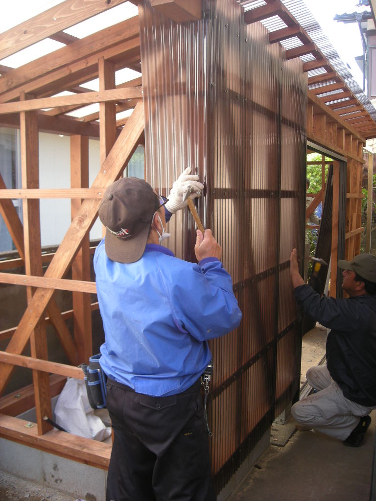 つづいて屋根材(ポリカ波板)を張って行きます!!