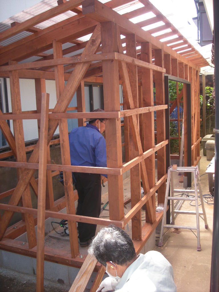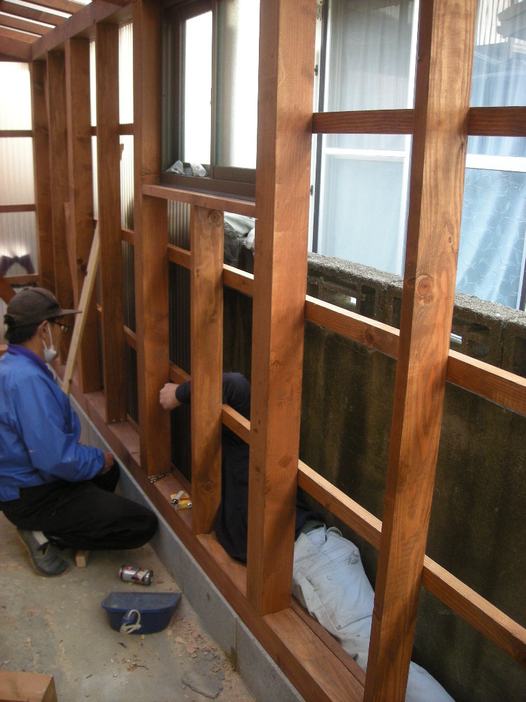 入口の引違い戸の枠と、後ろにサッシを取付け、外壁を張る下地胴ブチの施工まで終わりました!!