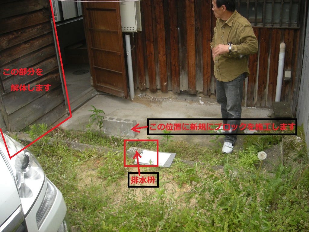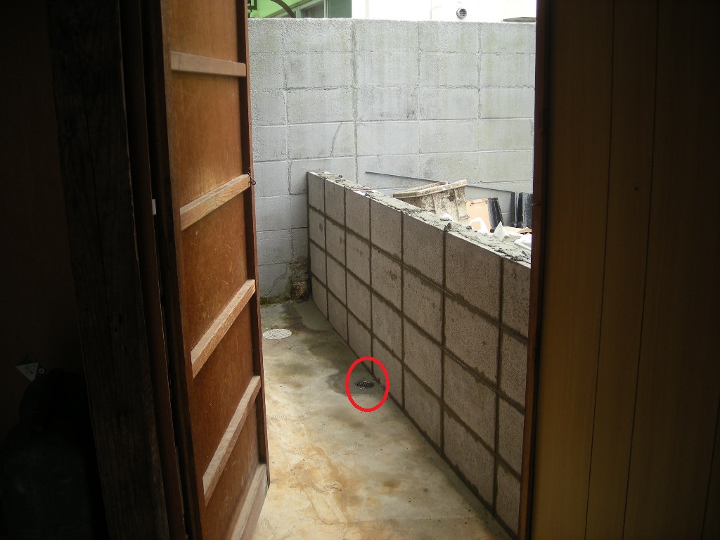 | ,排水管の整備後、ブロックを施工します!! | 勝手口を開け、内側から見る(○が排水目皿です)!! |