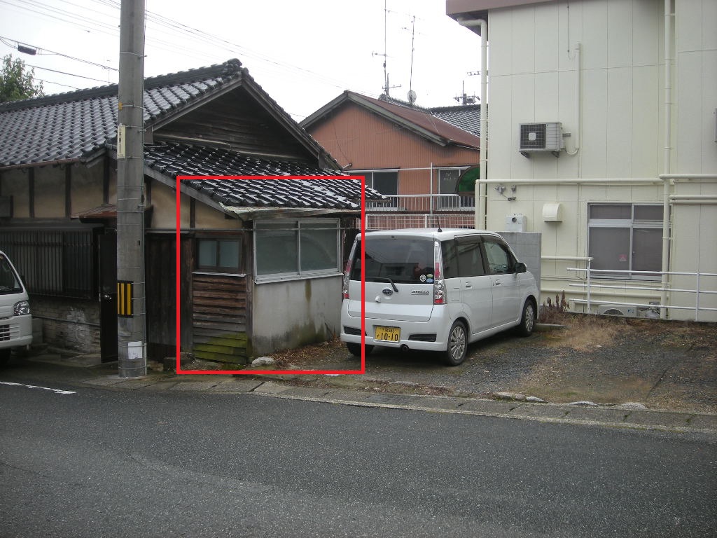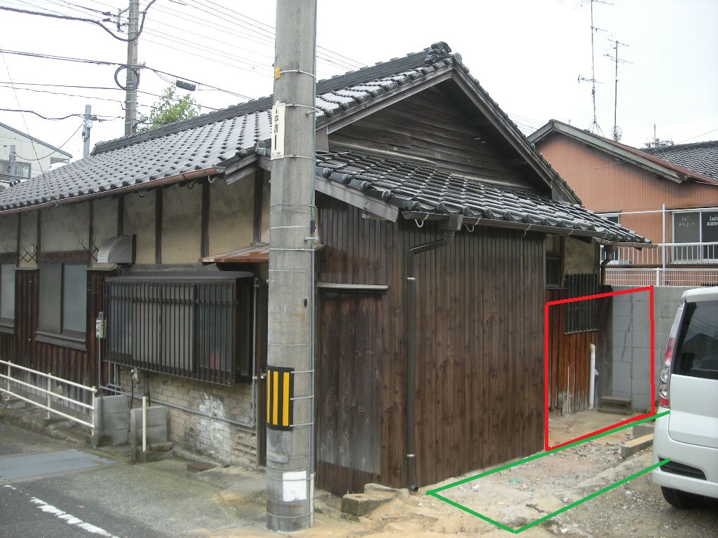 | 工事前(赤線で囲った浴室部分を解体します)!! | 工事後(赤線部分にブロックとフェンスを施工し青線で囲った部分を駐車場として整備します)!! |