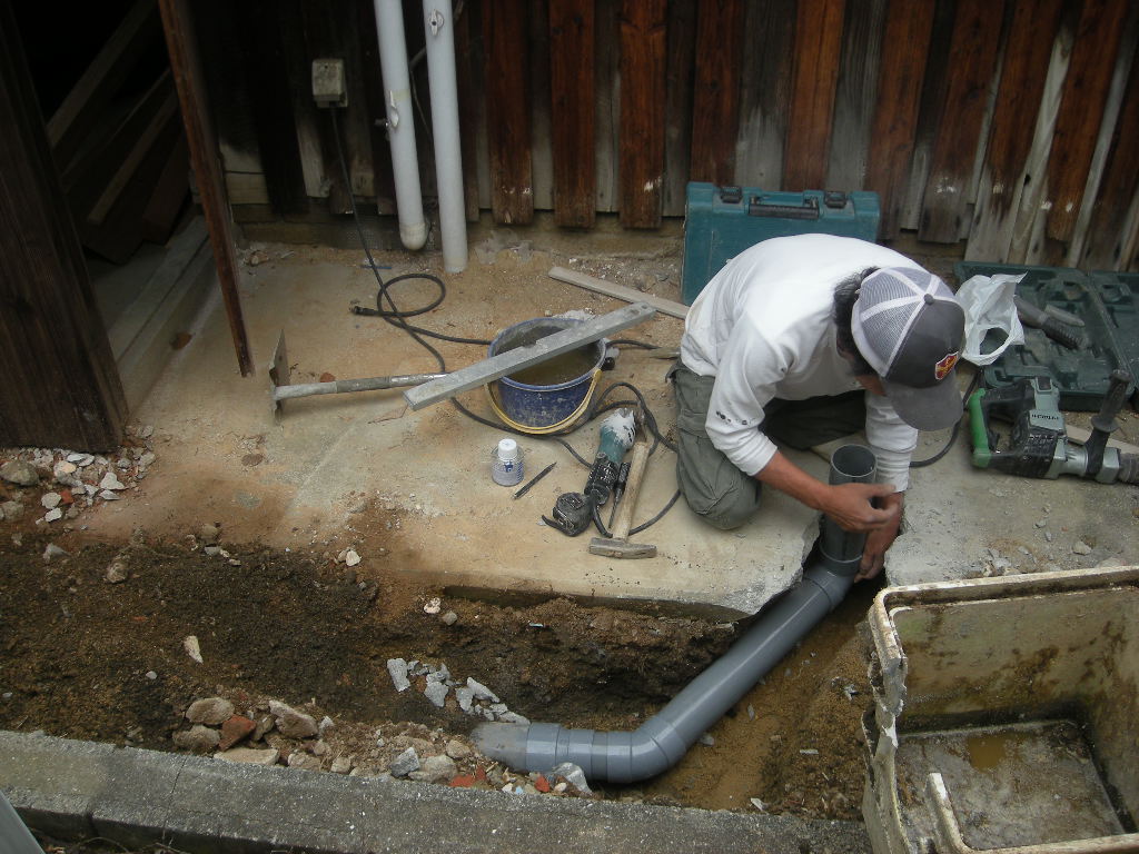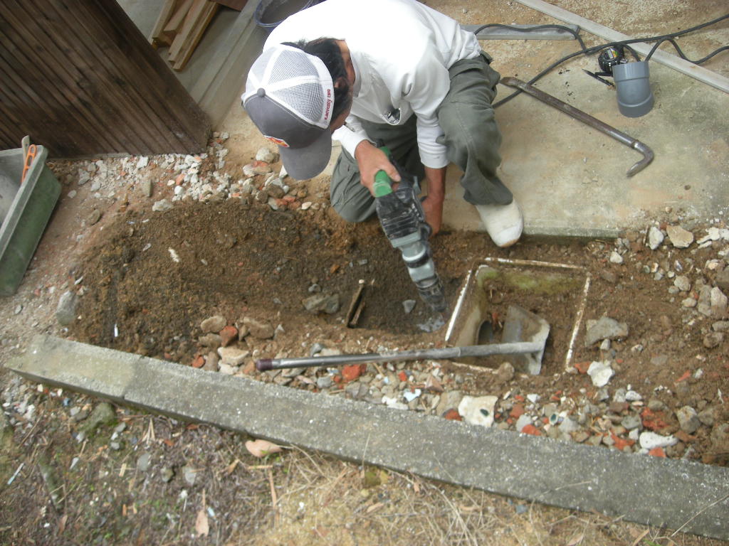 | 既存の排水枡を撤去します!! | 排水管を接続・延長し、排水目皿を取付けます!! |