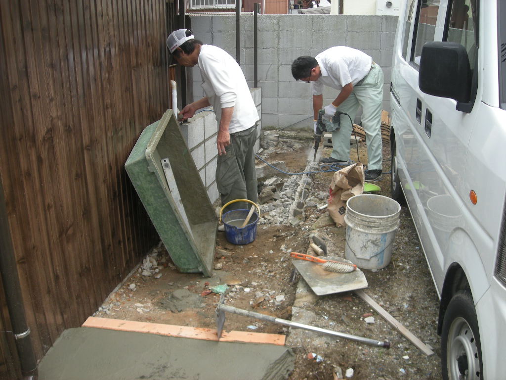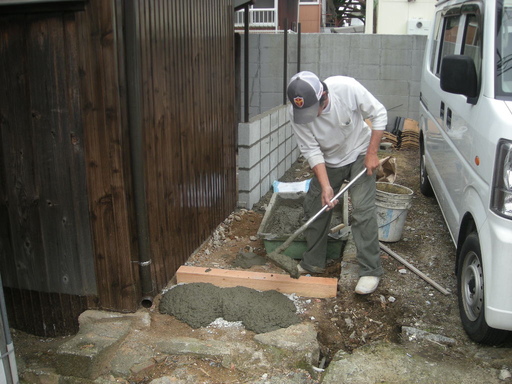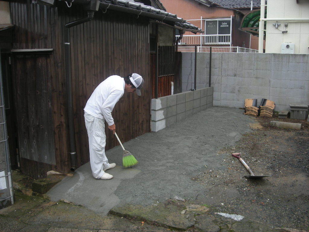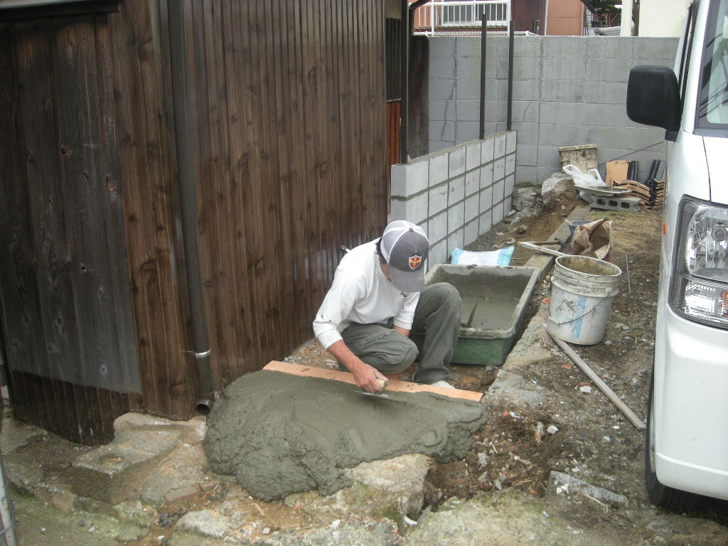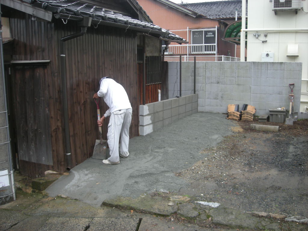 ◎前回のブログで紹介した小月の某邸の母屋を改修して、外の駐車場を拡張・整備する工事の、今回は左官さんの作業の様子を紹介します。