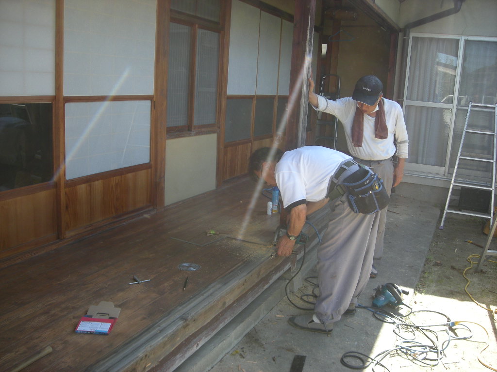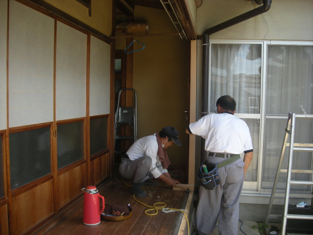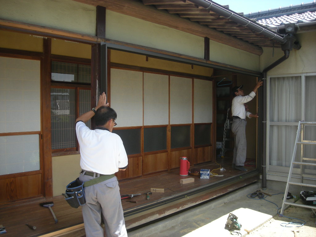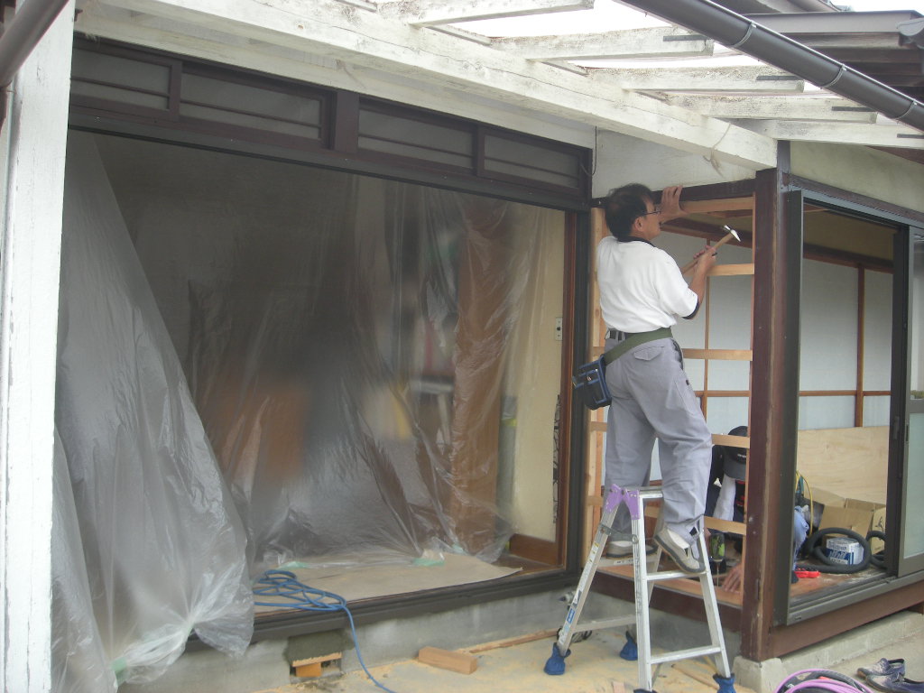 広縁の時と同様の作業をし、新規のサッシ枠を組付け、広縁の側面壁の下地づくりをします!!