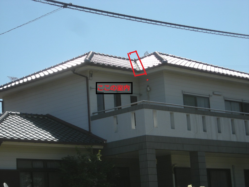 2階の部屋の天井に雨漏れがしていました!! その部屋の上の屋根の谷の板金(赤線で囲った部分)に問題があったので谷の板金を交換しました!!