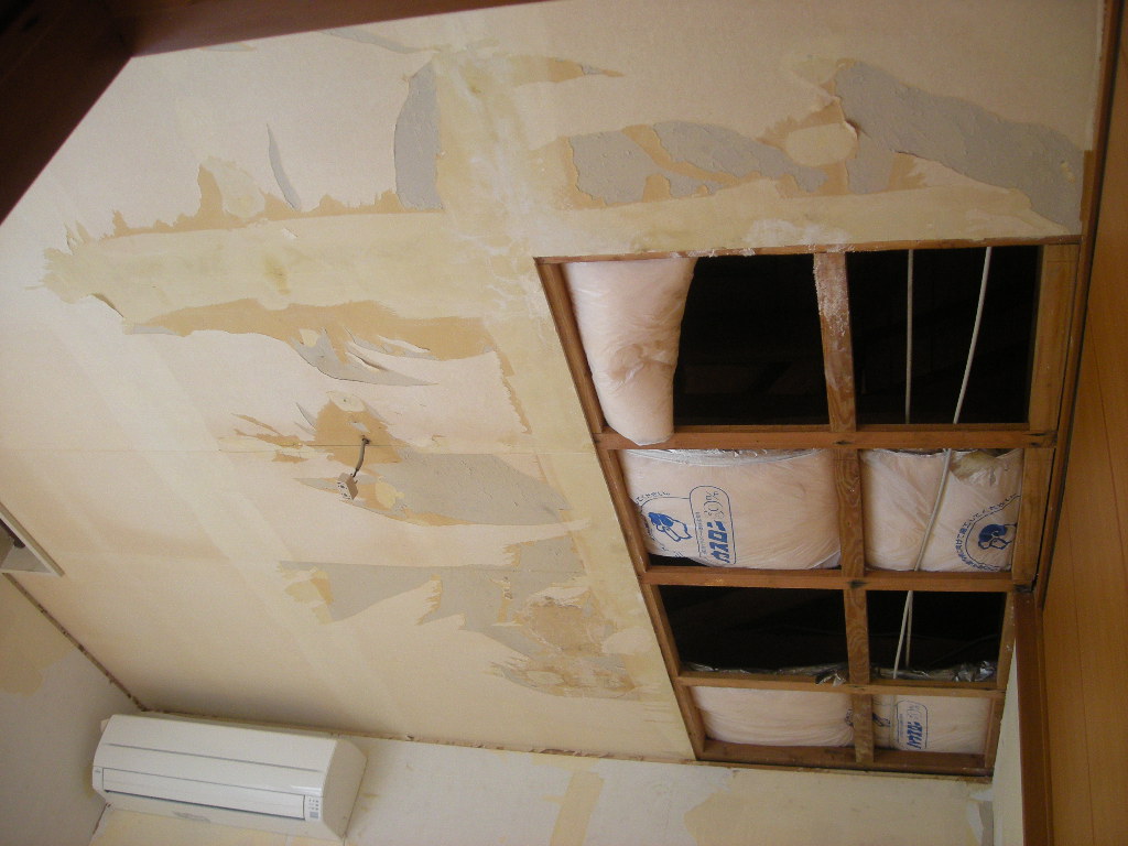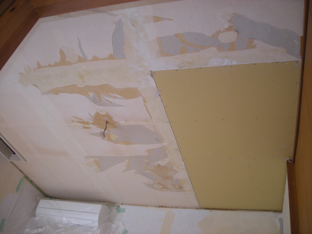 天井のクロスを剥いで調査したところ、下地や他の部分の天井には問題がなかったのでこの部分の天井の下地ボードのみ張替えました!!