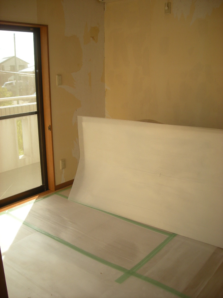 床に新規のフロア材を施工し、これから行う内装工事のときにキズを付けない様に養生をしました!!