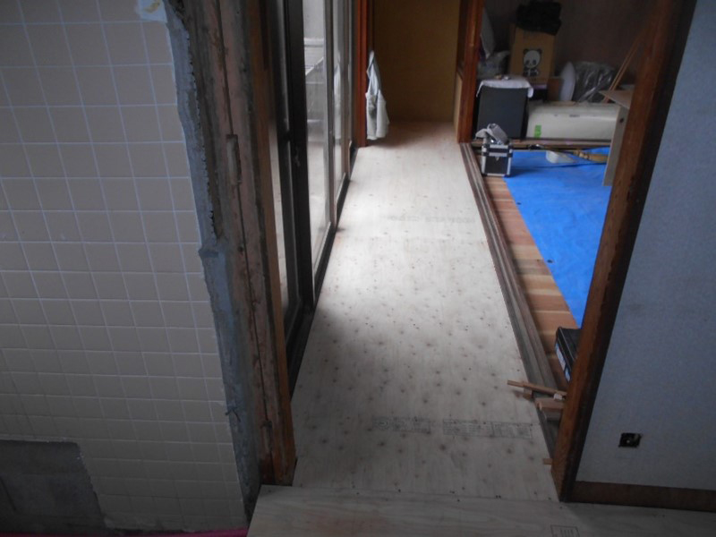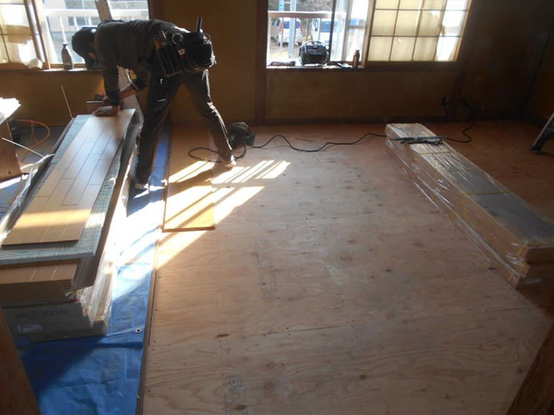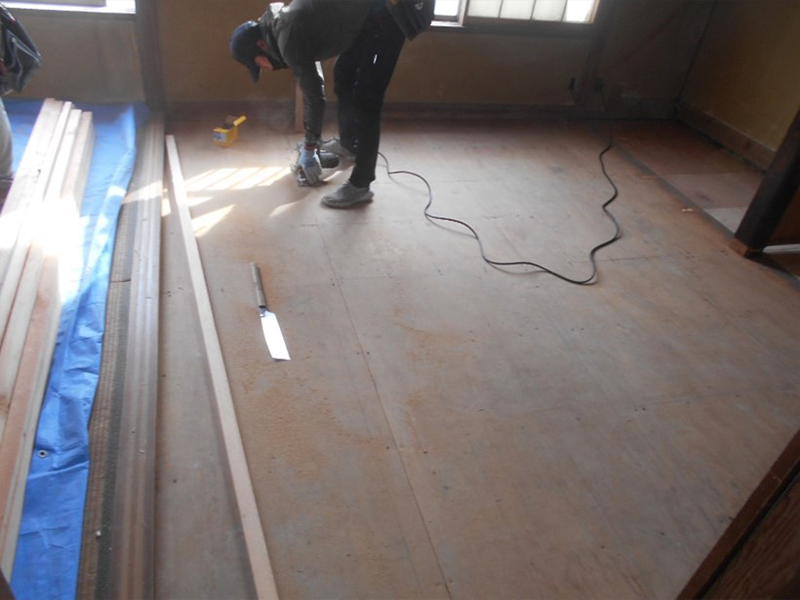 床がかなり傾いているので、床を全面解体し床組からやり直し、捨て貼り合板を施工後