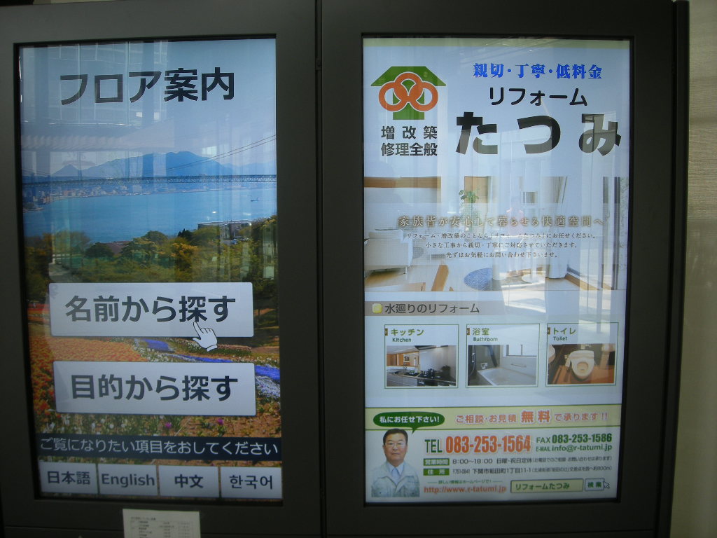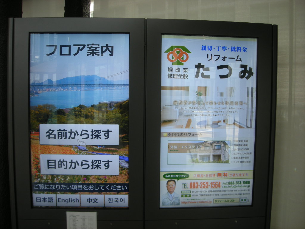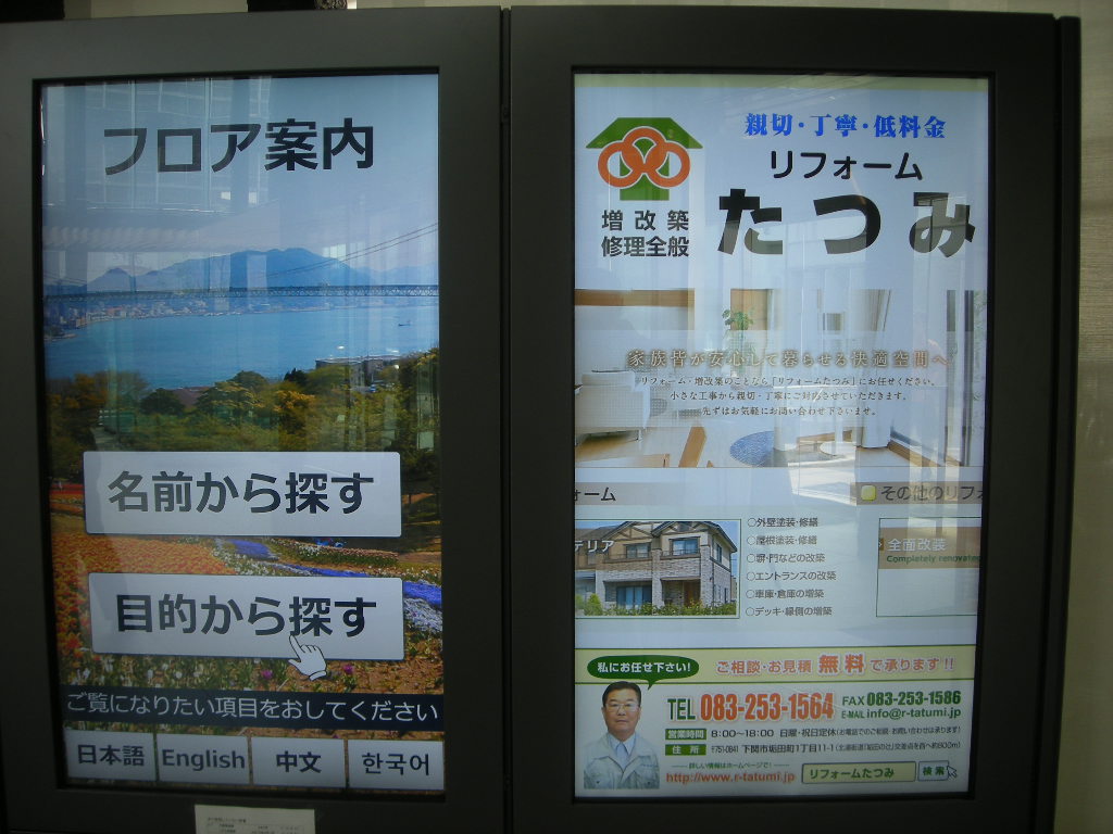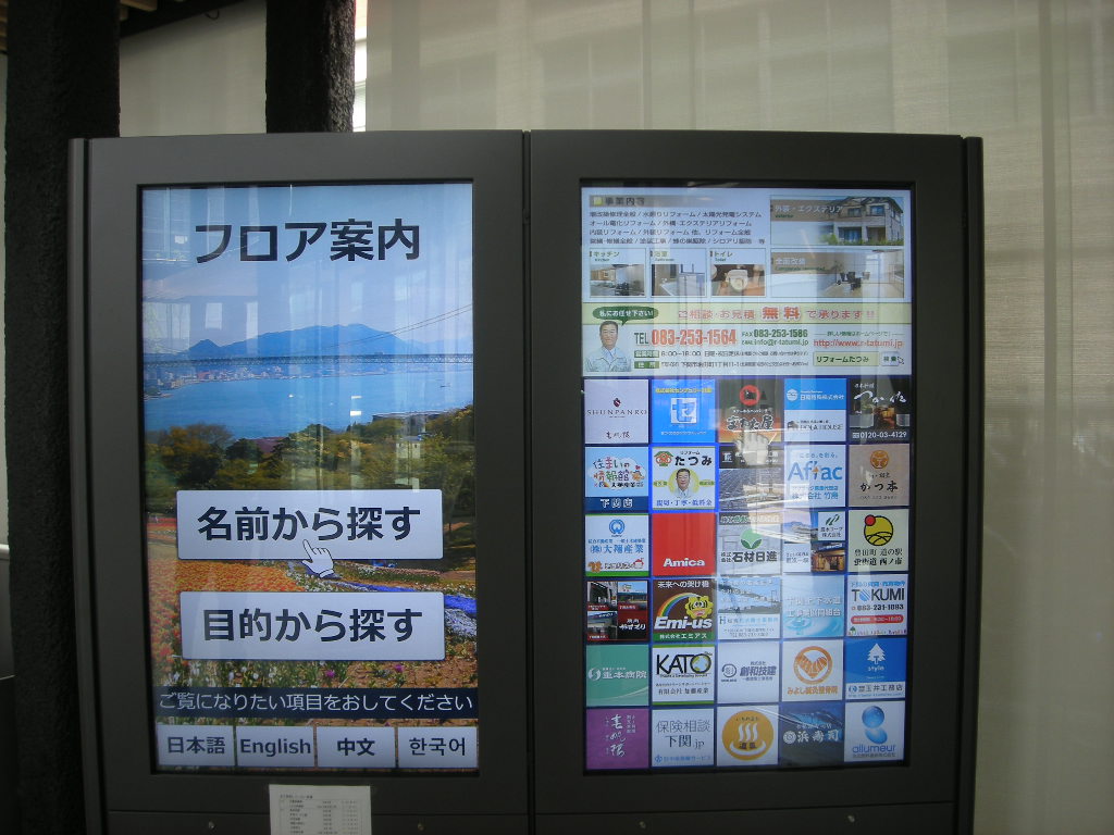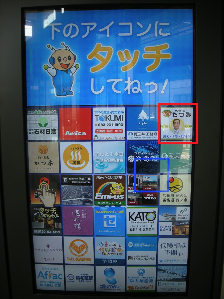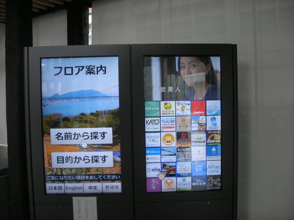 *案内板の右側には協賛した市内30社の企業のタッチパネル式のPR広告があり、
