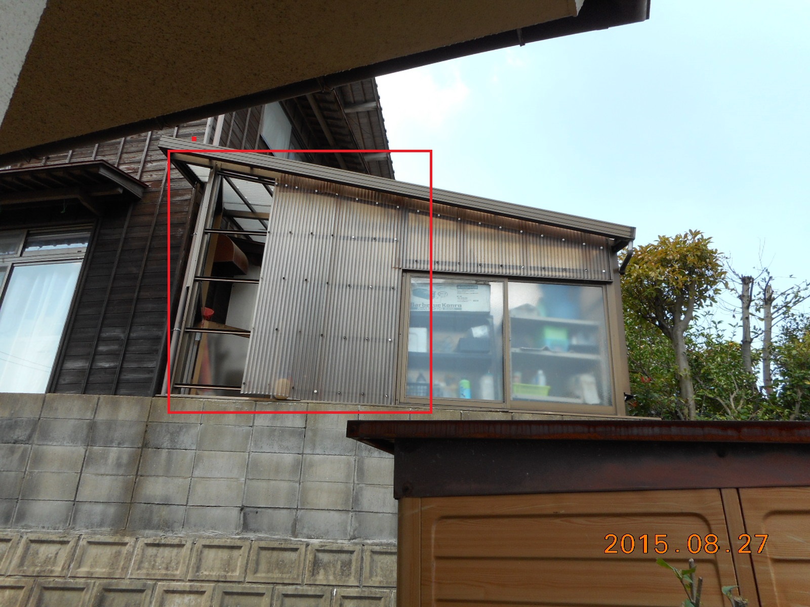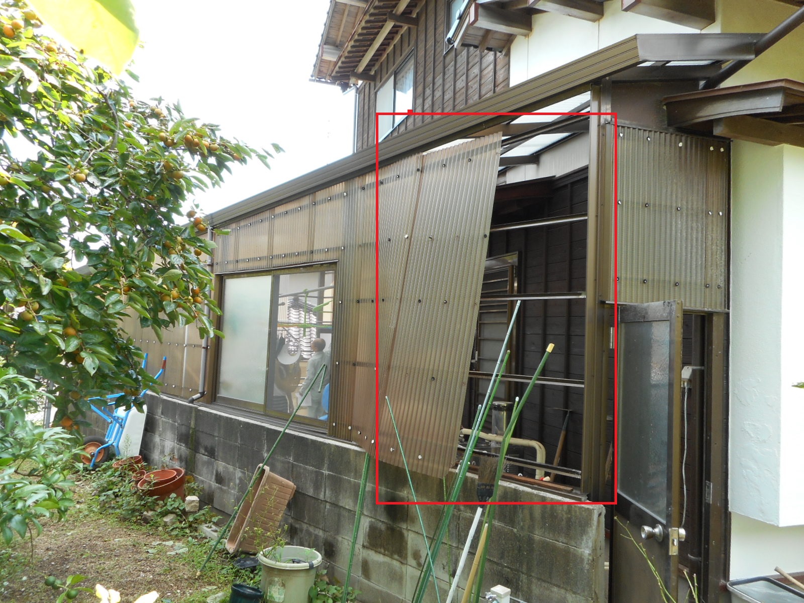ストックヤードの波板が剥がれました(側面の赤線で囲った部分)!!