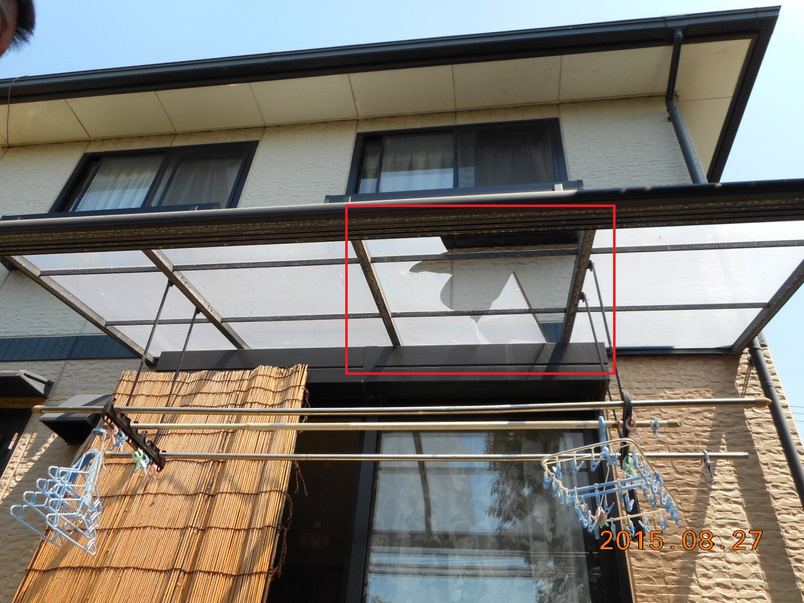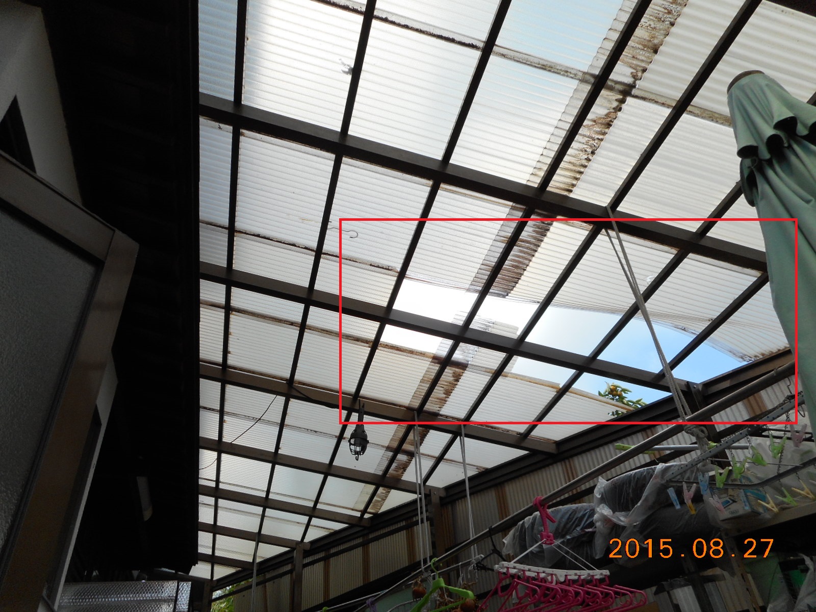 | カーポートの屋根の一部が剥がれました!! | テラスの屋根の一部も剥がれています!! |