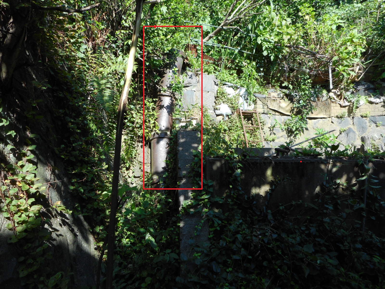 下から見る(赤線で囲った部分の排水管<昔の土管の様です>が壊れています!!