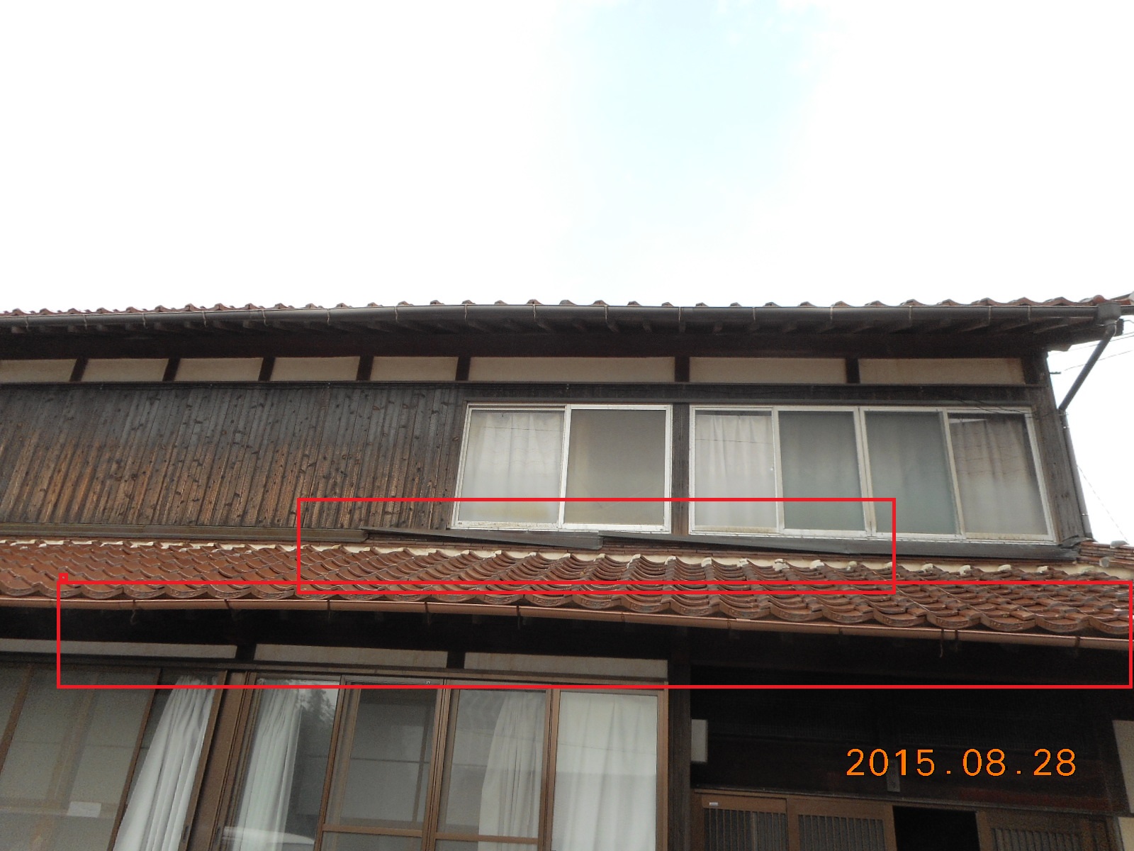 写真上の赤線で囲った部分の水切りが浮き上がっています。下の樋も変形しています!!